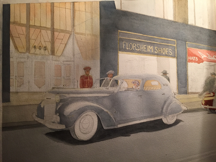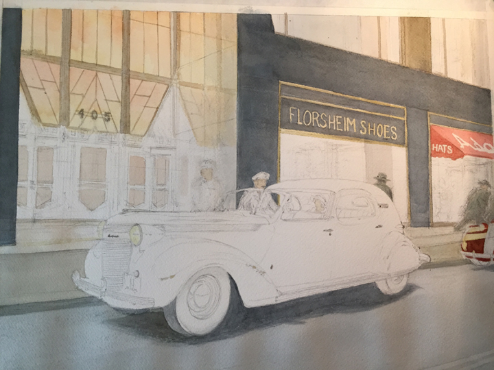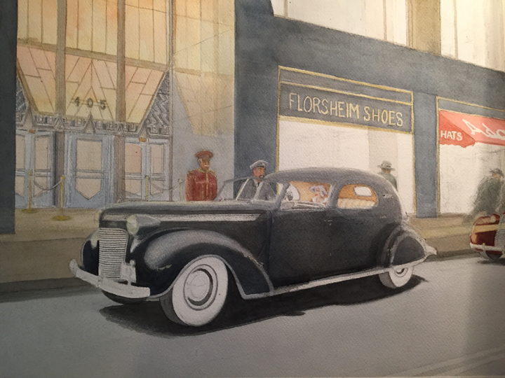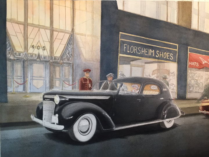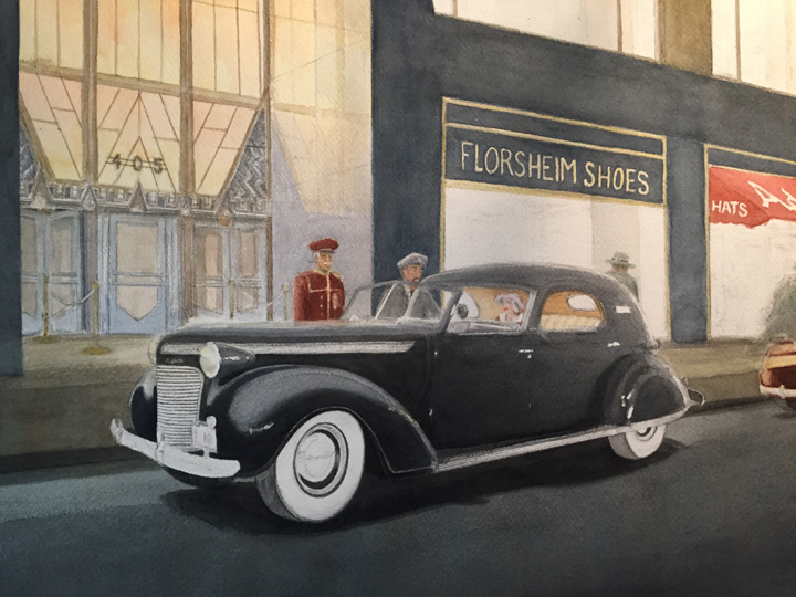 With the help of Wikipedia and Google, I found photos of the Art Deco entrances to the Chrysler Building, which I felt would perfectly complement the Art Deco town car and enhance the “Chrysler” context. Then I drilled down and discovered that among the ground floor tenants of the skyscraper were Florsheim Shoes and Adams Hats. I even found a photo of the building with a line of 1937-ish taxicabs in front—and there, easy to see, was the awning for Adams Hats, and a store to the left of it, by the entrance, whose name was not readable. I decided it would be Florsheim Shoes.