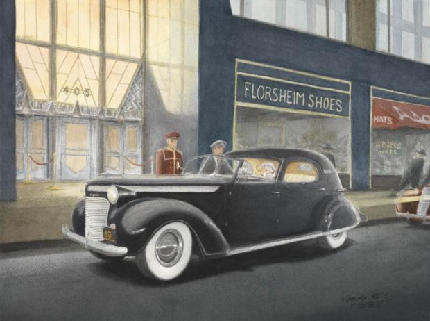 Mrs. Walter P. Chrysler's town car, custom built by LeBaron, in a fantasy scene at the Chrysler Building in New York City. The car was discovered on Long Island, New York, and was restored and shown at Pebble Beach in 2014, where it won its class. Mrs. Chrysler enjoyed the car for a very short time, as she passed away in 1938; her daughter inherited it, and her initials appear on the rear doors. This painting is intended to portray a moment in which Mrs. Chrysler is about to meet her husband in the evening, as passersby hurry past the darkened ground-level stores on Lexington Avenue.
