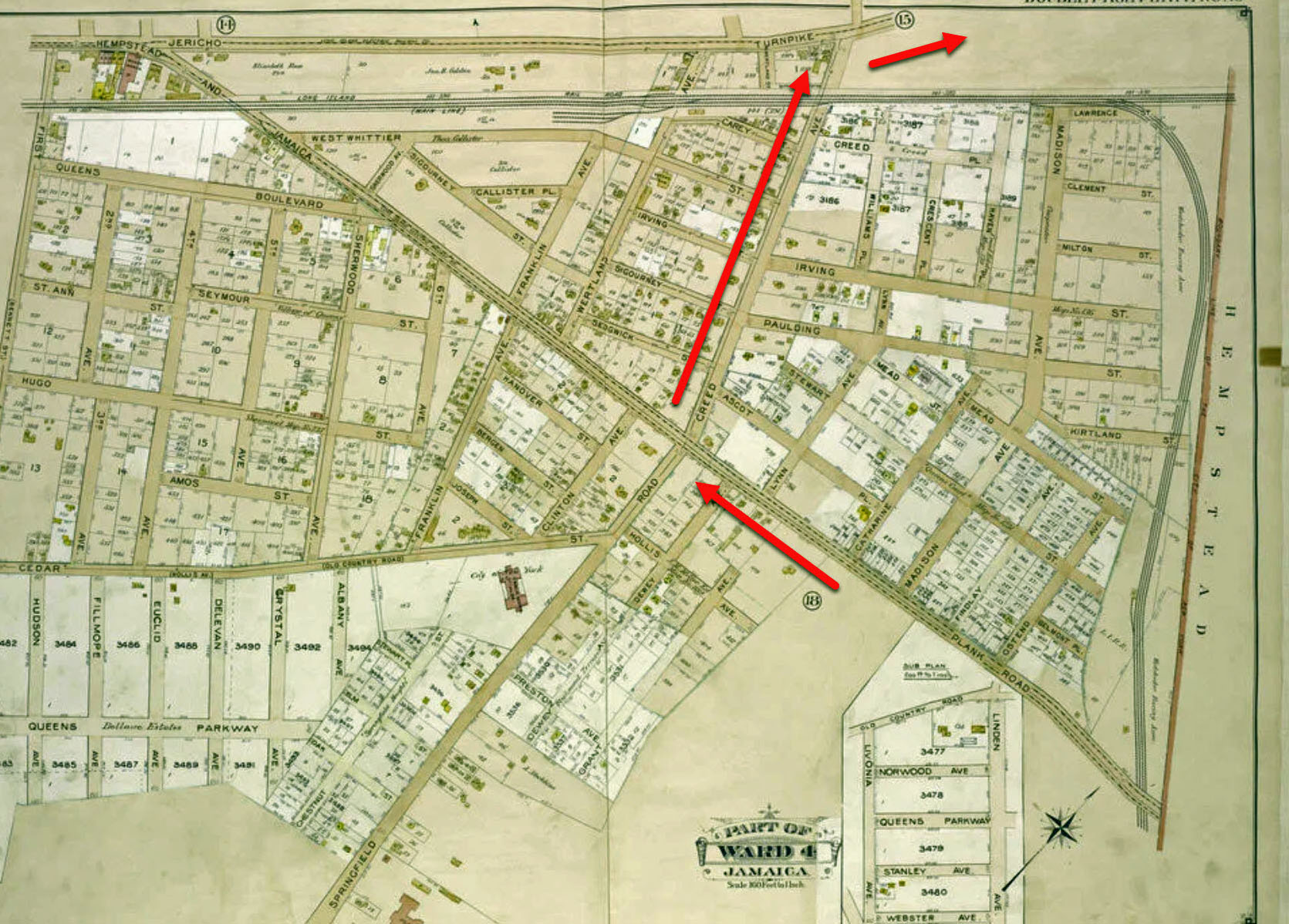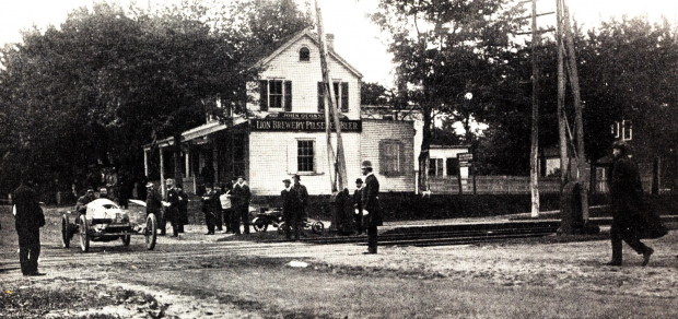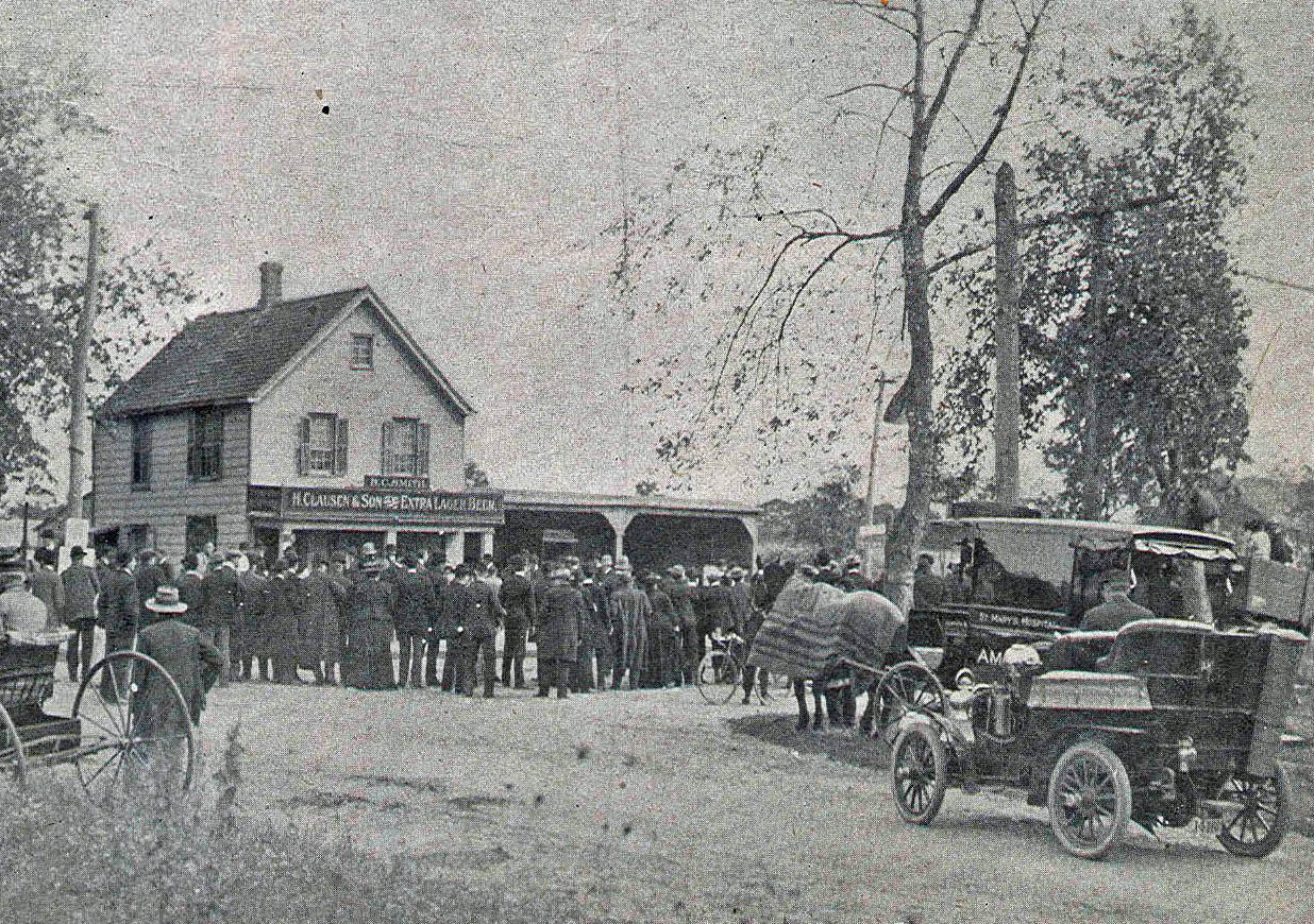 The first turn in Queens put the drivers onto Creed Avenue, also known as Springfield Avenue, for a brief stretch serving to connect back to Jericho Turnpike. A horse-drawn ambulance from St. Mary’s Hospital was stationed on the southeast corner of the turn, opposite a tavern, ready to assist in any accident.