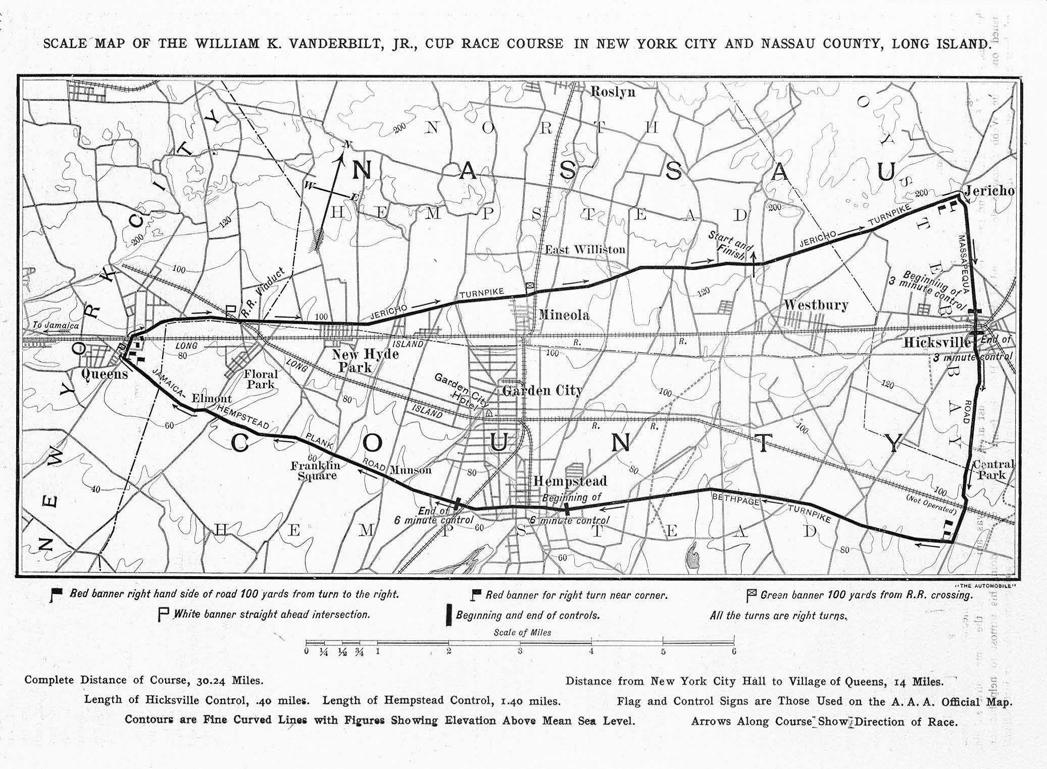 The only time that the six Vanderbilt Cup Races (1904-1910) were held outside Nassau County was the initial race in 1904. One and a half miles of the 30-mile 1904 course were in Queens County of New York City made up of three roads: Jamaica-Hempstead Plank Road, Creed Avenue and Jericho Turnpike.