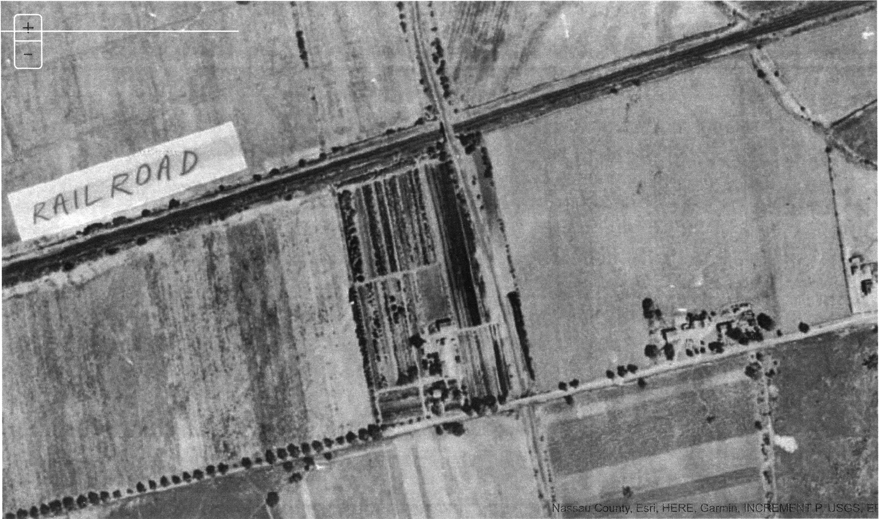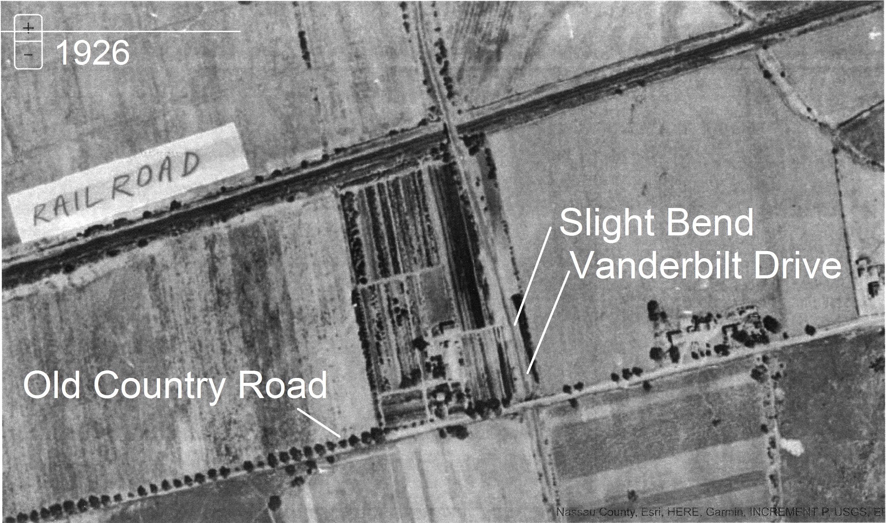 Sam – Tricky section, I believe it went like this; After crossing the RR bridge southbound on the LIMP, the parkway didn’t follow the street grid and headed slightly eastward towards Vanderbilt Drive. Soon after the descending ramp there was a slight right bend before reaching Old Country Road, aligning the LIMP with Vanderbilt Drive. The right bend can’t be seen in Robertson’s 1909 photo but visible in the aerial sending to Howard.