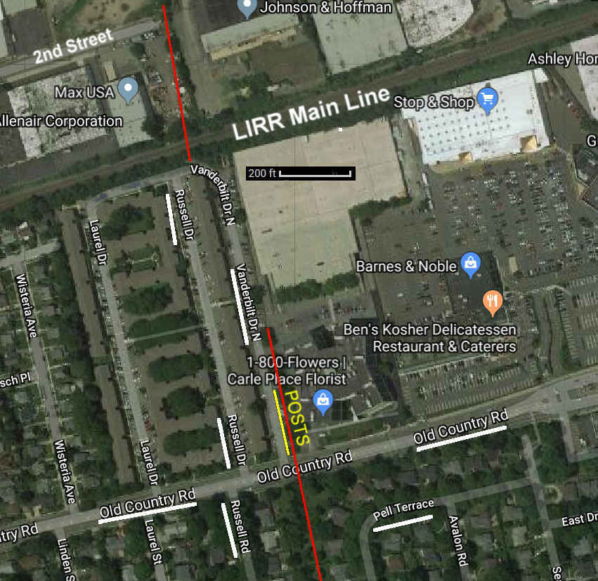 Thanks for sharing a wonderful moment, Joe! All of Ron’s 1983 pix are at <http://sbiii.com/limpbrdg.html#rrbridgs>. I also beg your indulgence. Dave, those posts alongside Vanderbilt Drive North re right on the RoW. The alignment of the LIMP here never made any sense to me. The bridge points ever so slightly to the right (west) of the apartment roof centerline, and the RoW swings to the west just before OCR, yet the RoW berween Pell Terrace and Russell Road is EAST of all this! Doctored aerial sent to HK. The N-S boundary between Mineola and Carle Place at this spot shifted after the LIMP was built but that has nothing to do with this alignment question. HELP! Sam, III