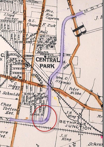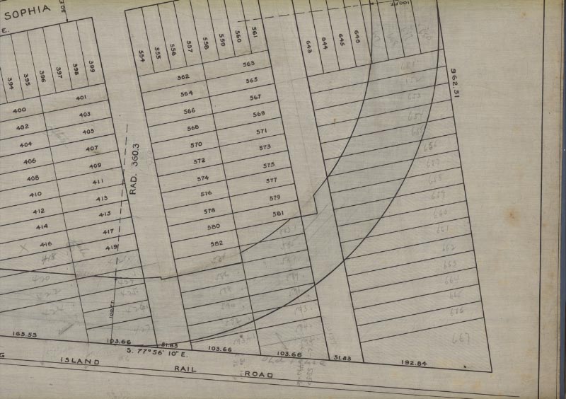 This is the September 1907 survey of the curve in Bethpage. The property was purchased from Hermann Windhorst. The two nearby streets were named for the original owner; Hermann Avenue and Windhorst Avenue.