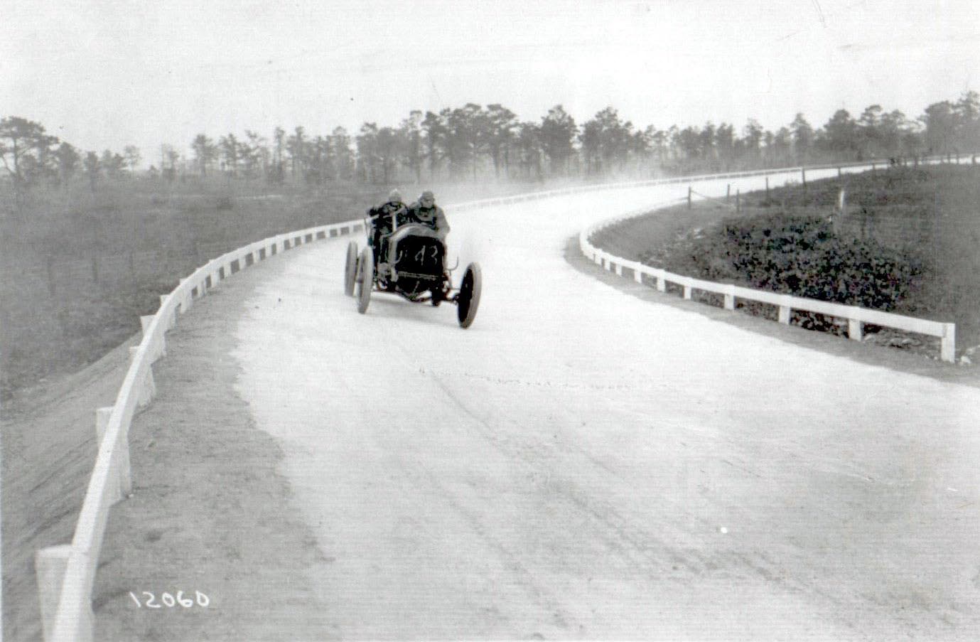 Then: 1908 During the Motor Parkway Sweepstakes, Axel Peterson's #M36 Rainer battled William Haupt's #P41 at the Deadman's Curve. A Long Island Rail Road train can be seen in the background acting as a spectator stand or to bring spectators to the Hempstead Plains grandstand.