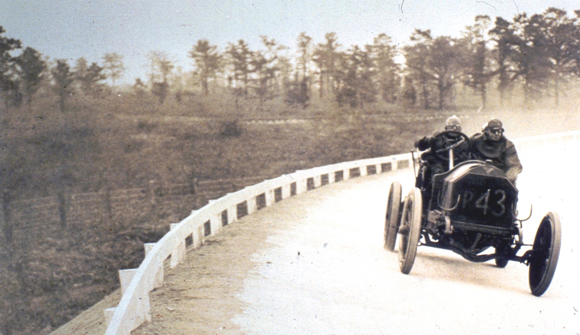 Then: 1908 The P43 Simplex driven by Frank Lescault at the Bethpage "Deadman's Curve" during the 1908 Motor Parkway Sweepstakes.