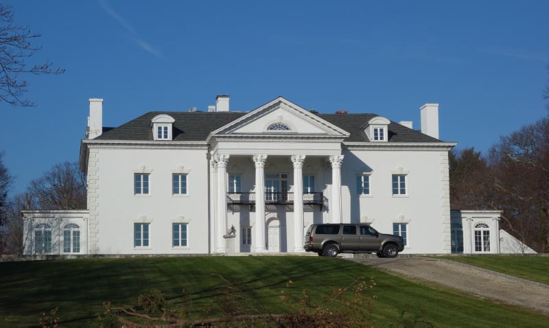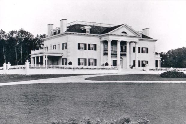 The Georgian Revival stuccoed mansion has a two-story high, Corinthian-column portico marking an entrance to a great hall.