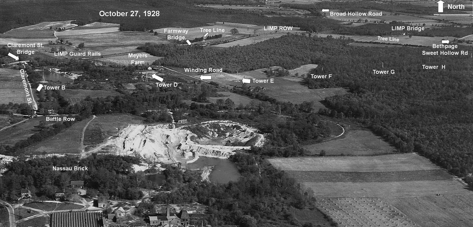 Actually, if one is to look up the history of Joseph Picone and Son, as I recall they have been occupying that site from as far back as when the bridge on Broad Hollow Road was still in existence—the next bridge East, remembering, that until the mid-fifties, Broad Hollow Rd and Route 110 were the same two lane winding road, with the 110 we know today taken from the route of the Cross-Island Trolley. Aerial wise, anything focusing on the Church in the Wildwood should also show the route of the LIMP, with the LIMP following the North side of Ruland Rd and Hi-tension LILCO lines until it crossed eventually following the Southern side of Colonial Springs Rd, again Googling the area will show the remnants of the LIMP.
