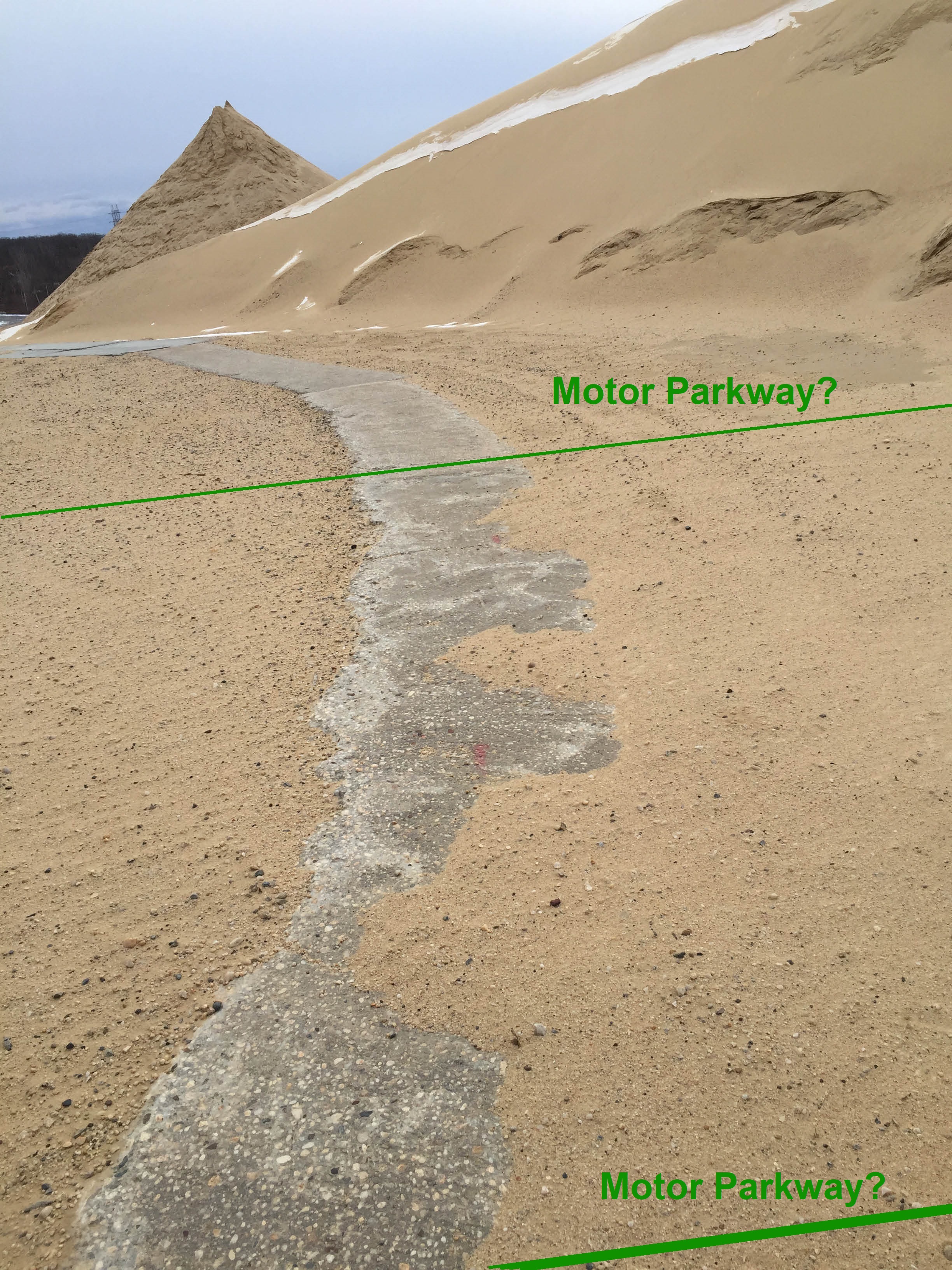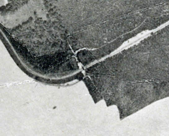 The curved pavement cannot be Motor Parkway. The westward roadway did curve to the right towards the north, not left. I super zoomed into the pavement using ‘Paint’ and determined it was crudely laid out in small sections, but the lower end of the strip does resemble LIMP pavement. Could’ve been laid out for sandpit vehicles avoiding muddy areas. Time for a debate!
