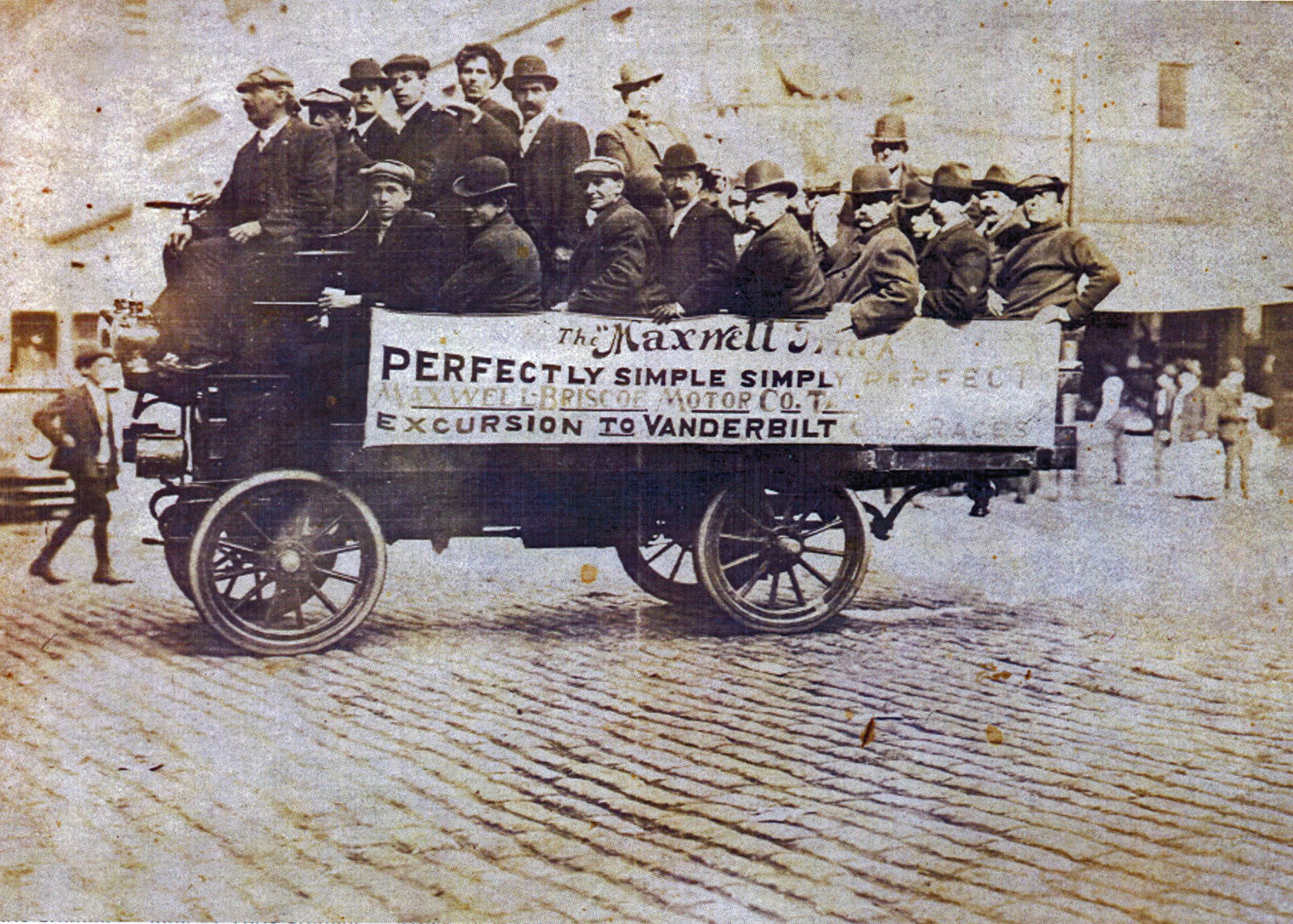 This "perfectly simple, simply perfect" Maxwell truck brought these men to the 1906 Vanderbilt Cup Race.