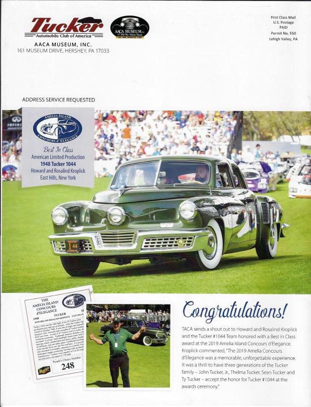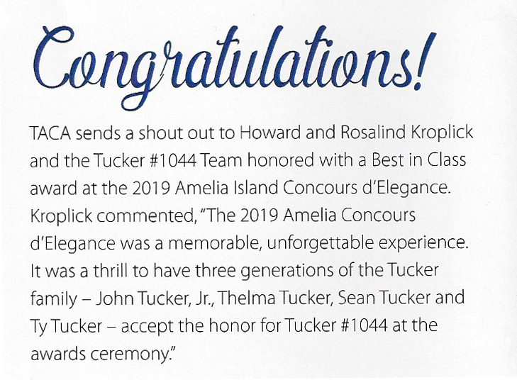 The Tucker Club of America sent a shout out to the Tucker 1044 Team on the back cover of its official magazine Tucker Topics.