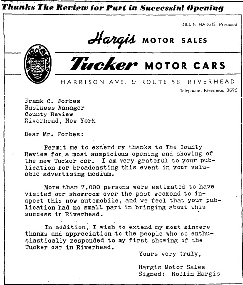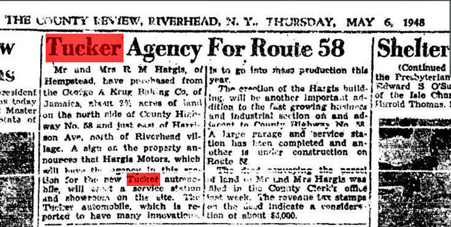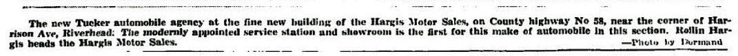 In May 6, 1948, The County Review (Riverhead) reported that the Hargis family had purchased property in Riverhead for the 'new Tucker automobile". Haargis built a new building for the dealership.