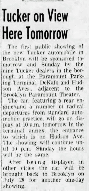 A viewing on the Tucker in Brooklyn was newsworthy. The Brooklyn Daily Eagle, July 9, 1948. Courtesy of Gary Hammond.