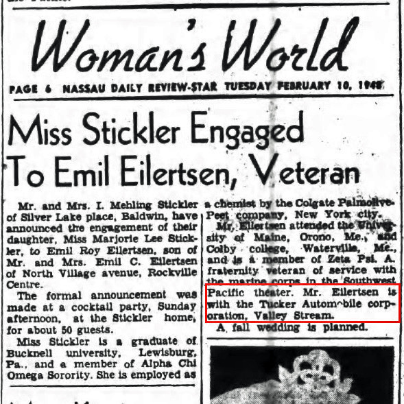 On February 10, 1948, the Nassau Daily Review-Star reported the engagement off Marjorie Stickler to Emil Eilertsen, employed by "Tucker Automobile corporation, Valley Stream." Courtesy of Gary Hammond.