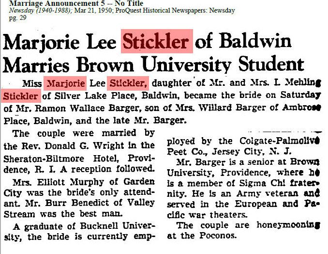 Update: 2/20/2017: Gary Hammond reports: In answer to Ken Wiebke's comment on the Stickler - Eilertsen engagement announcement I did a little more digging and based on the attached March 21, 1950 Newsday article it never happened! She instead married someone else in March 1950.