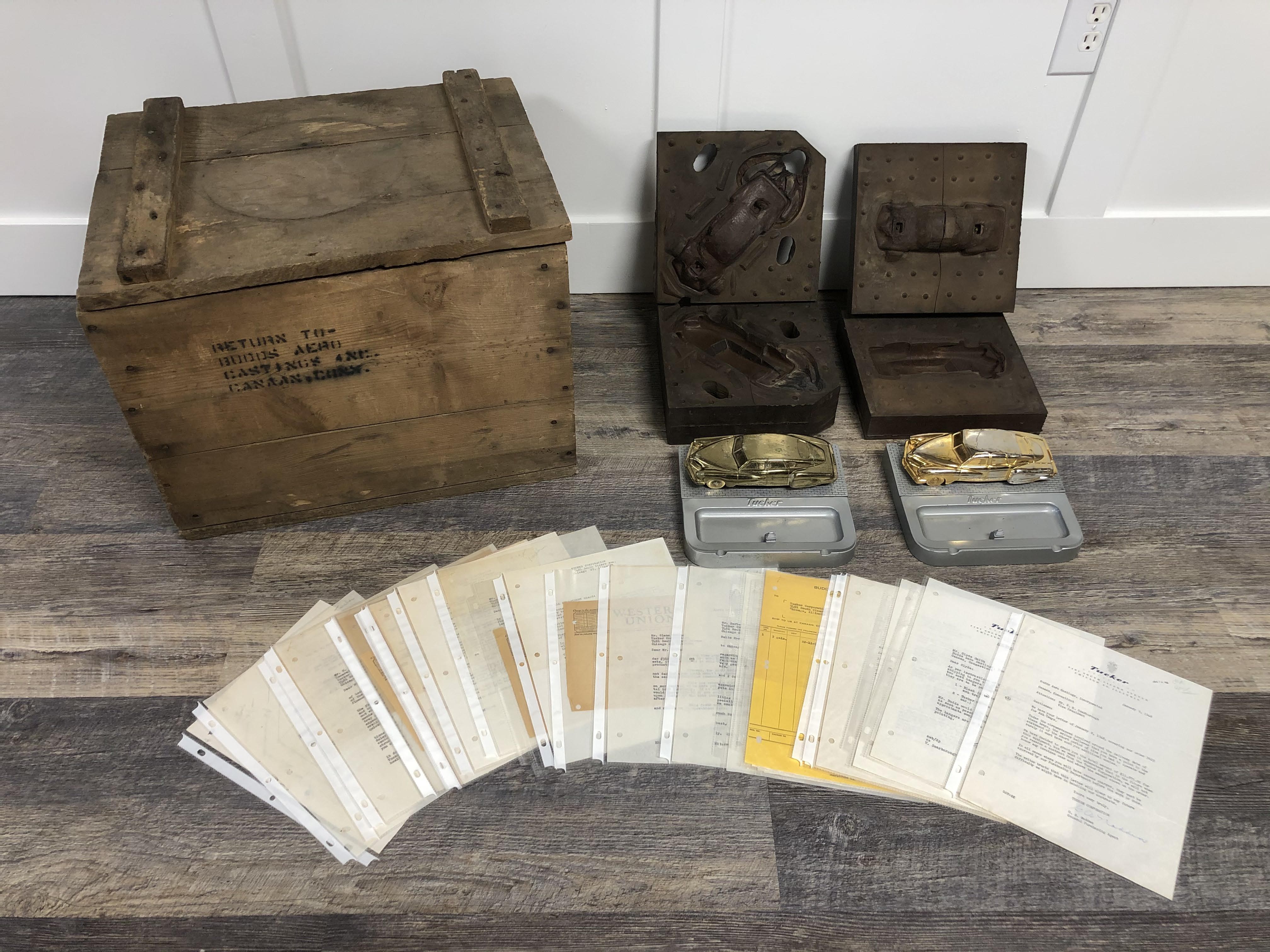 I called Mark who confirmed my suspicion and said the molds were pulled from a barn in an original shipping crate along with a few examples of the desk sets themselves that had never been shipped to the Tucker corporation. There was also a folder full of paperwork that said “Tucker” but the specific contents of the folder were unknown. Over the next week we learned more information about the items which were located in New Canaan, Connecticut in the possession of the descendants of a gentlemen name Harold “H. H.” Budds. Mr. Budds owned Budds Aero Castings and produced the desk sets for the Tucker Corporation in 1948. Very soon thereafter my brother Sean and I were on our way to New Canaan, CT to bring back the lot and learn more than we ever could have imagined about the history of the Tucker desk sets.