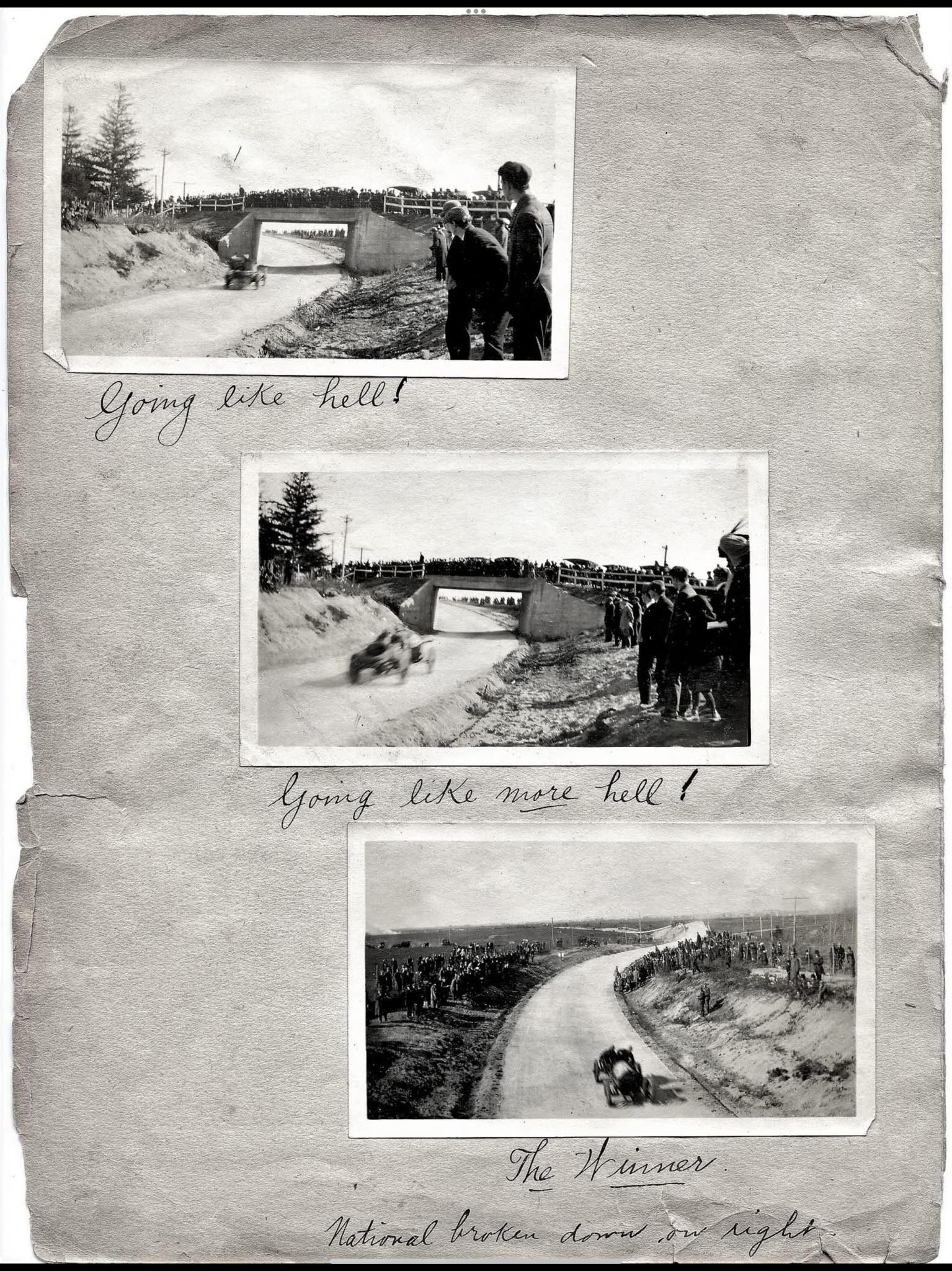 Page one displays some unfortunate break-downs during the race.The photo in the center is an unknown location of spectator automobiles during the race.