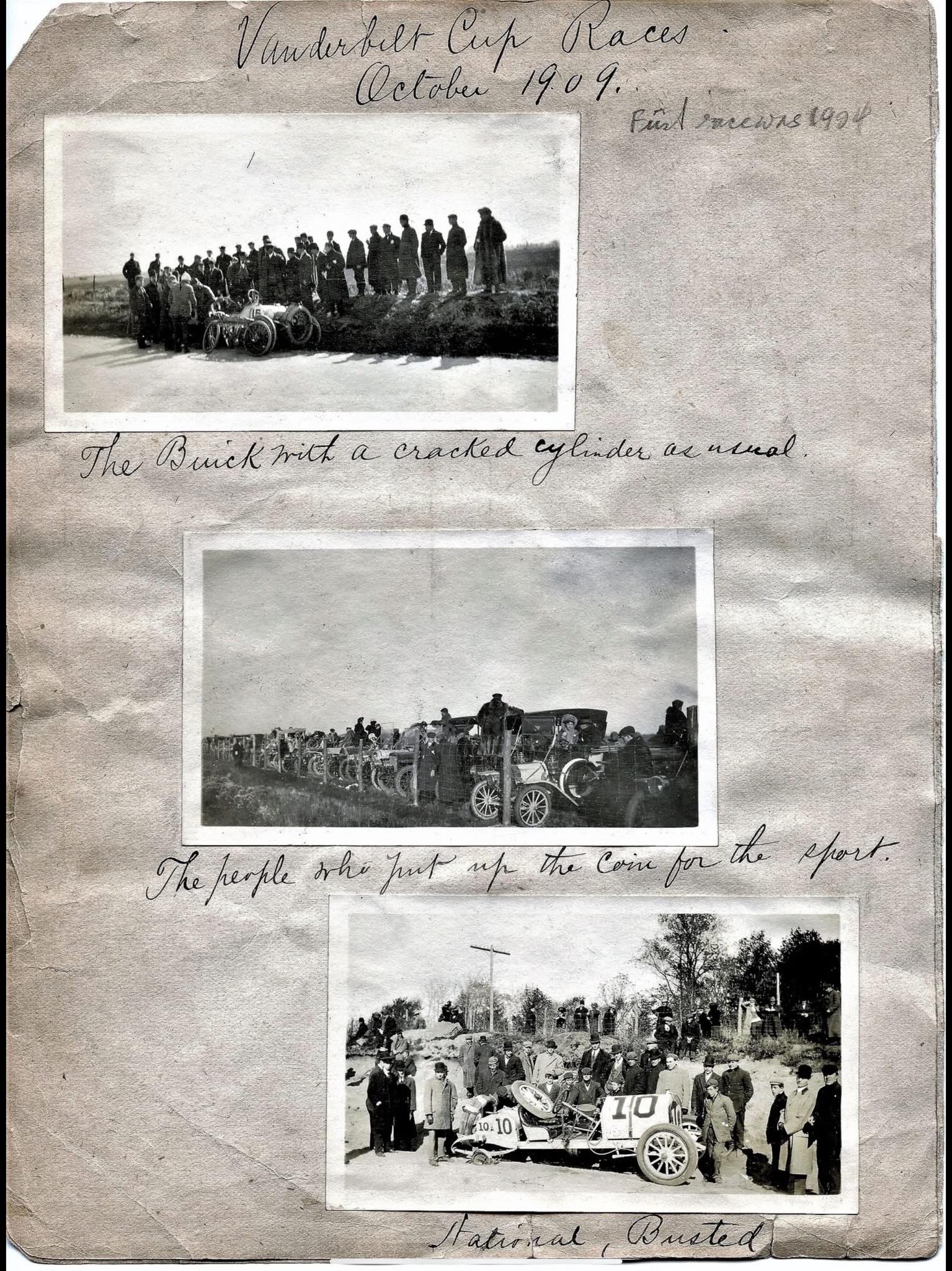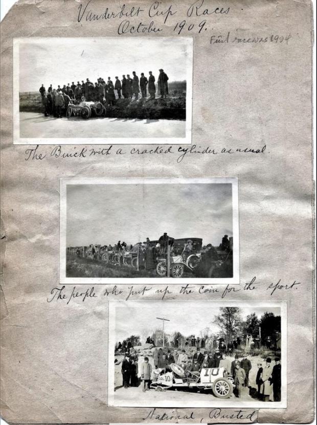 The top photo on the first page of his grandfather's photo album is of the 1909 #15 Buick driven by Louis Chevrolet. Unfortunately, Chevrolet suffered a cracked cylinder that ended his race.
