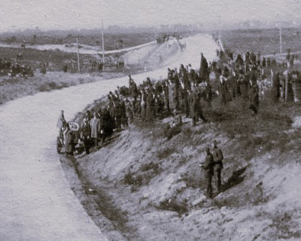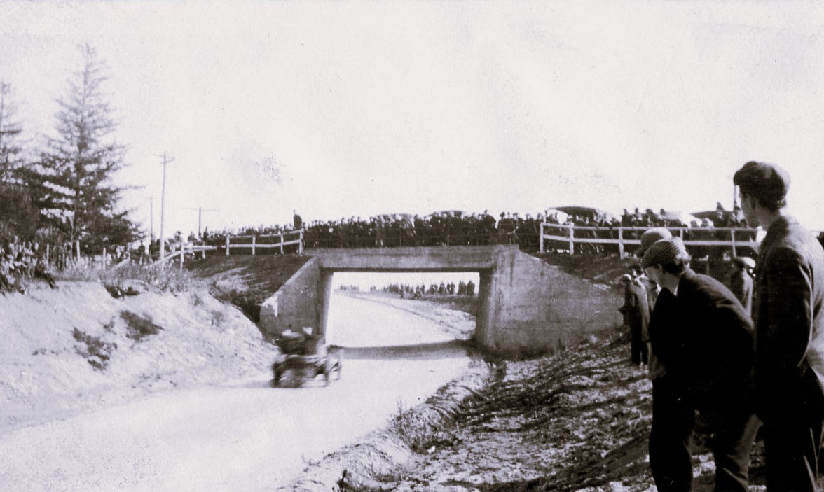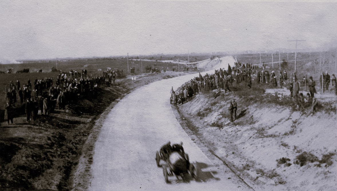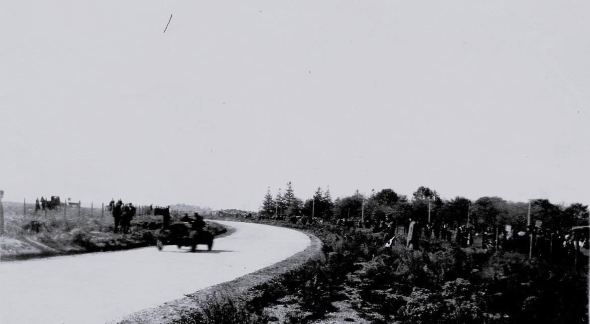Not sure what the caption is mentioning, but this is a very tricky photo to determine location. The open land to the left, the trees to the right and the corner flag man is all there is to work with in this photo. As of now, location is inconclusive, but most likely not far from the Stewart Ave bridge where the Heyer party was viewing the race.