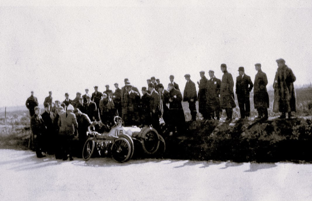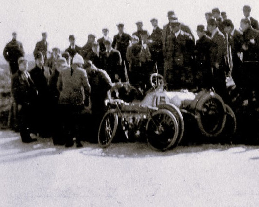Close up reveals an antique motorcycle leaning against the Buick. Impossible to determine if Louis Chevrolet is in the photo. Maybe the only person not wearing a hat from removing his helmet?