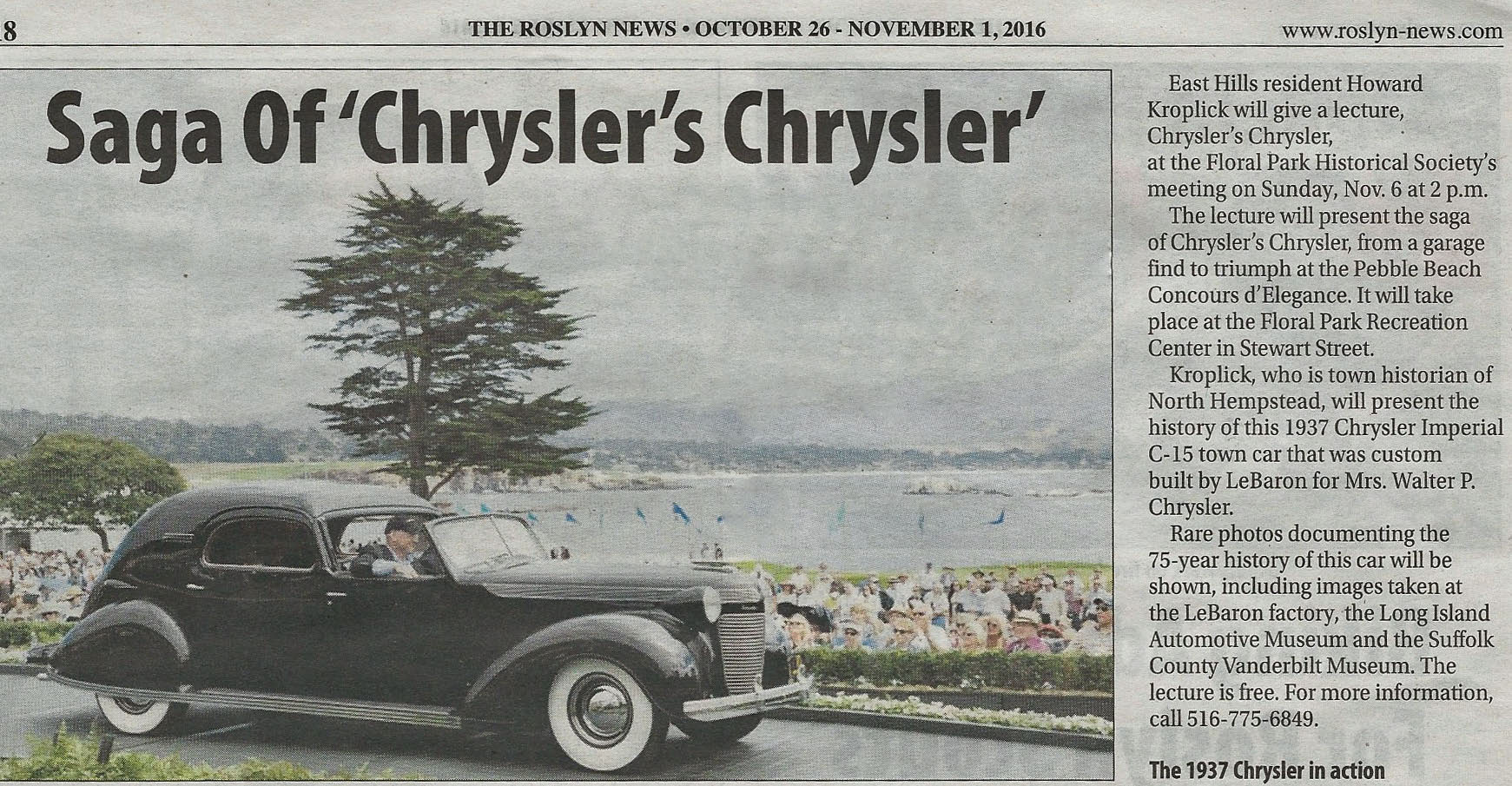 This week's Roslyn News featured an article on the upcoming presentation on "Chrysler's Chrysler" to be held at the Floral Park Historical Society's meeting on Sunday, November 6, 2016 at 2:00 pm.