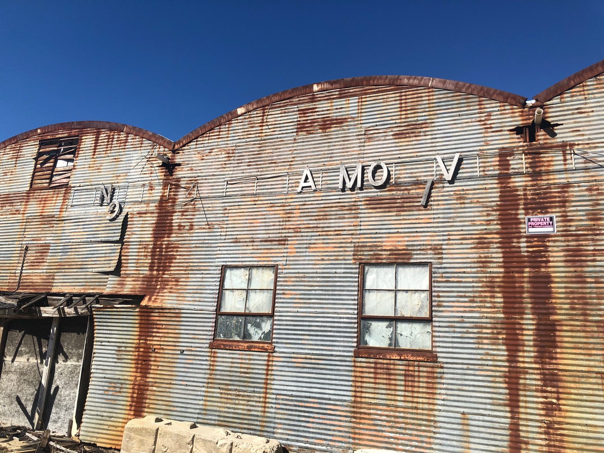 Some of the lettering for "Long Island Automotive Museum" are still hanging on.