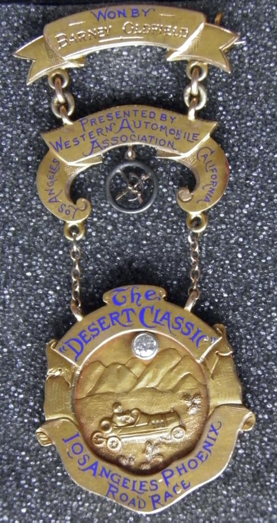 Barney Oldfield Gold Master Driver of the World Medal from the November 1914 Cactus Derby Race also known as the Desert Classic Race from LA to Phoenix. He raced against Olin Davis, Louis Chevrolet, Louis Nikrent, Cliff Durant, Bill Bramlett among a few. Master Driver of the World medal. Presented by Western Automobile Association.