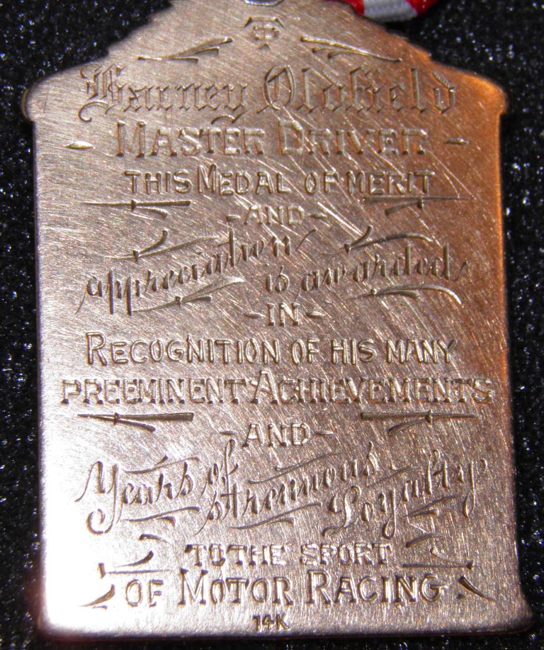 Copy reads: "Barney Oldfield-Master Driver-This Medal of merit and appreciation is awarded in recognition of his many preeminent achievement and years of strength and loyalty to the sport of Motor Racing."