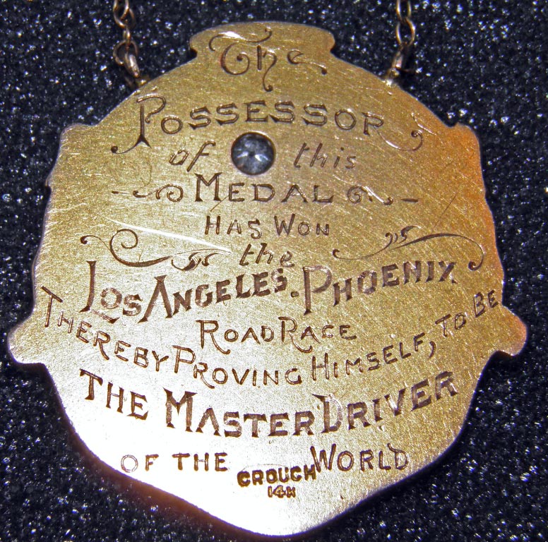 Copy reads: "The Possessor of this Medal has won the Los Angeles Phoenix Road Race, Thereby proving himself, to be The Master Driver of the World"
