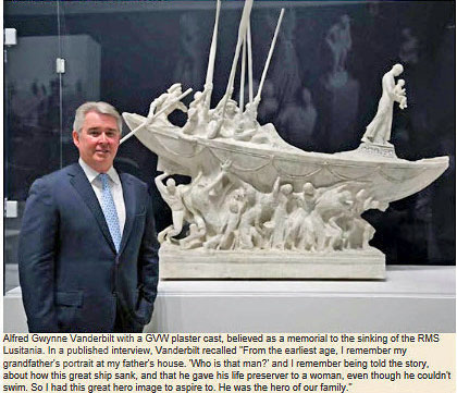 Alfred Gwynne Vanderbilt (1877-1915) was William K. Vanderbilt Jr.'s cousin and the owner of the FIAT driven by Paul Sartori in the 1904 and 1905 Vanderbilt Cup Races. Alfred Vanderbilt was traveling with his valet Ronald Denyer on the Lusitania to a meeting of the International Horse Breeder' Association. When Lusitania was torpedoed, Vanderbilt and Denyer assisted many others, especially children, to safety. Vanderbilt made no attempt to save himself, and was last seen giving his lifebelt to second cabin passenger Alice Middleton. Vanderbilt was lost in the sinking and his body was never recovered.