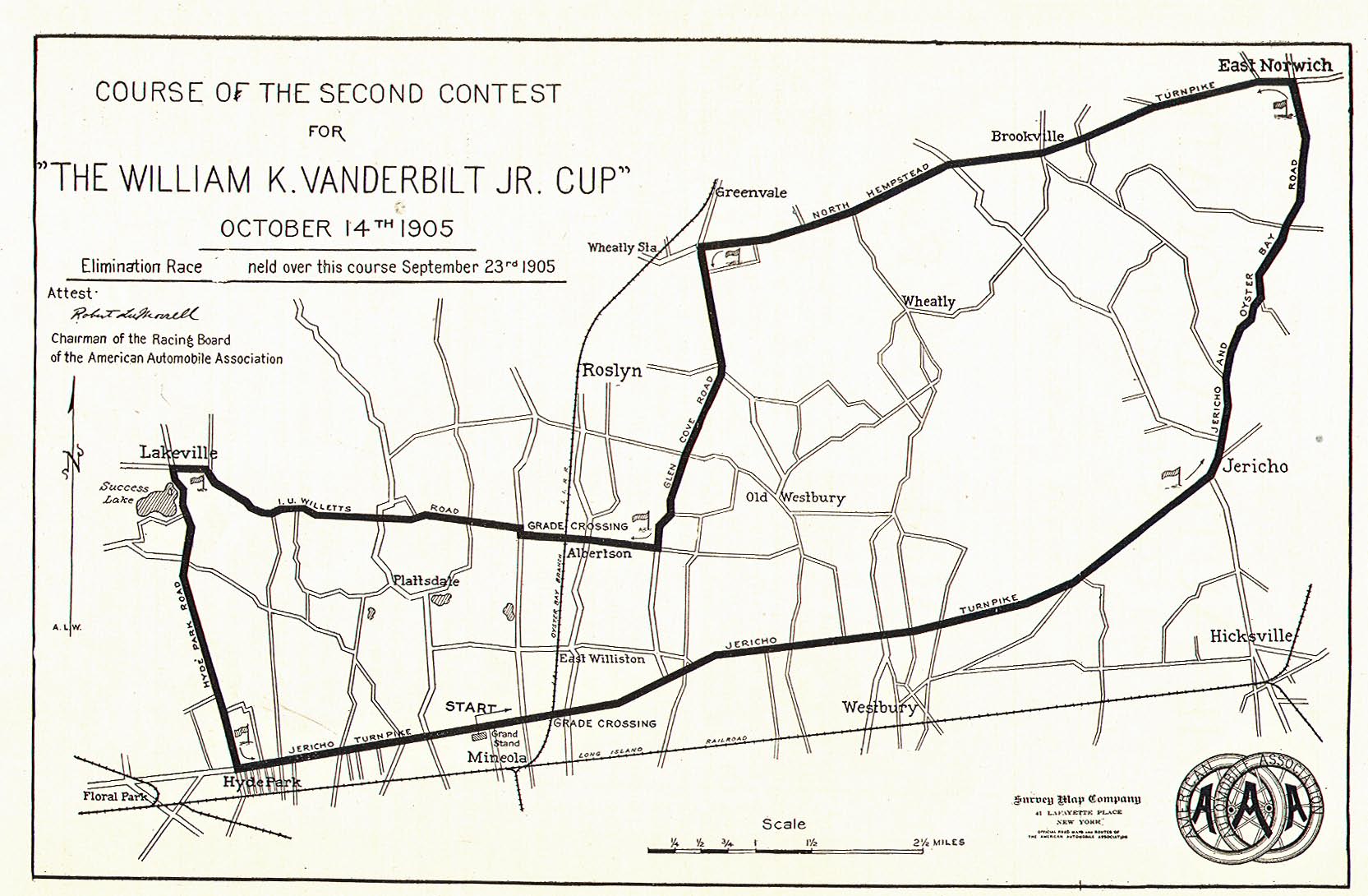The north-east corner of both the 1905 and 1906 Vanderbilt Cup Race courses was in East Northport at the intersection of Jericho-Turnpike and North Hempstead Turnpike.