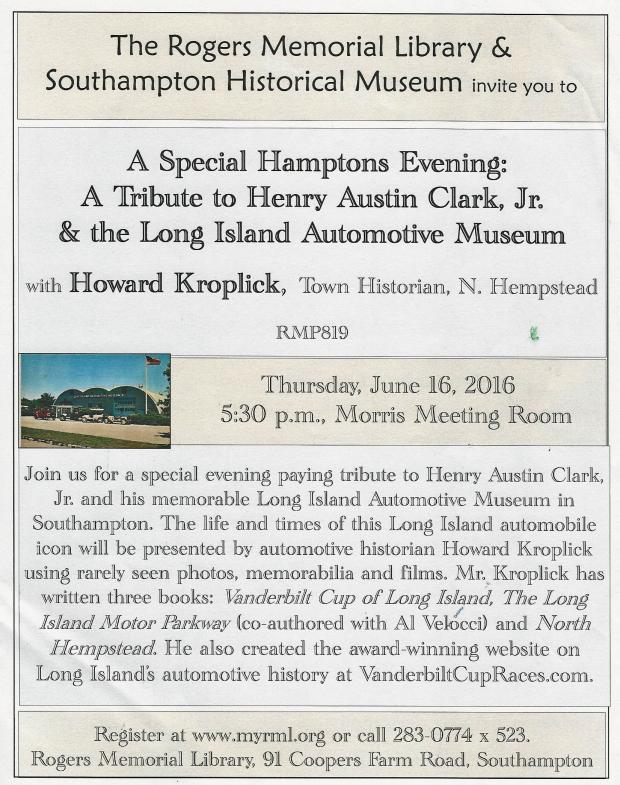 The Rogers Memorial Library and Southampton Historical Museum invite you for a special tribute to Henry Austin Clark, Jr. and his memorable Long Island Automotive Museum on Thursday at 5:30 pm in Southampton. Penny Wright, Director of Adult Programs at Rogers Memorial Library, has informed me that preregistration for the program is over 100 people with members of the Clark family and several former museum employees expected to attend.