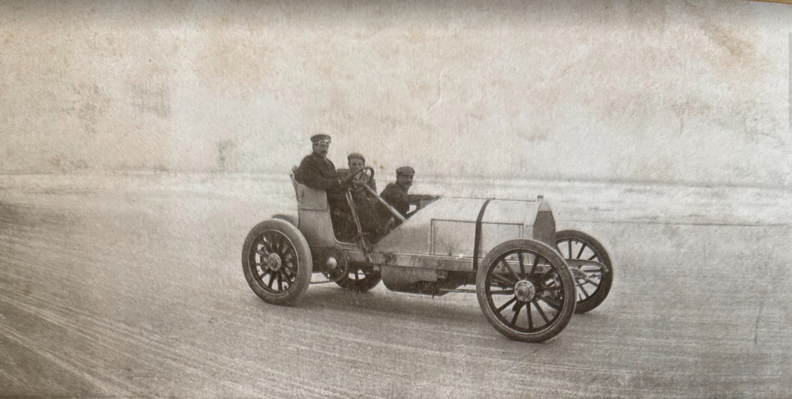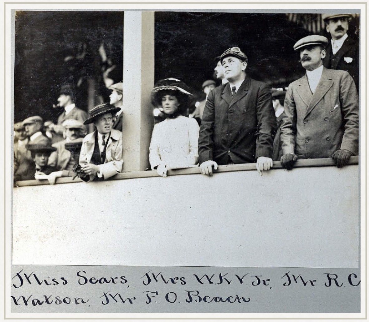 Ormond Beach, Florida, 1904, R.C.W. Jr. standing on the Renault in the background with Virginia “Birdie” Vanderbilt in front of him watching Willie K. break the land speed record.