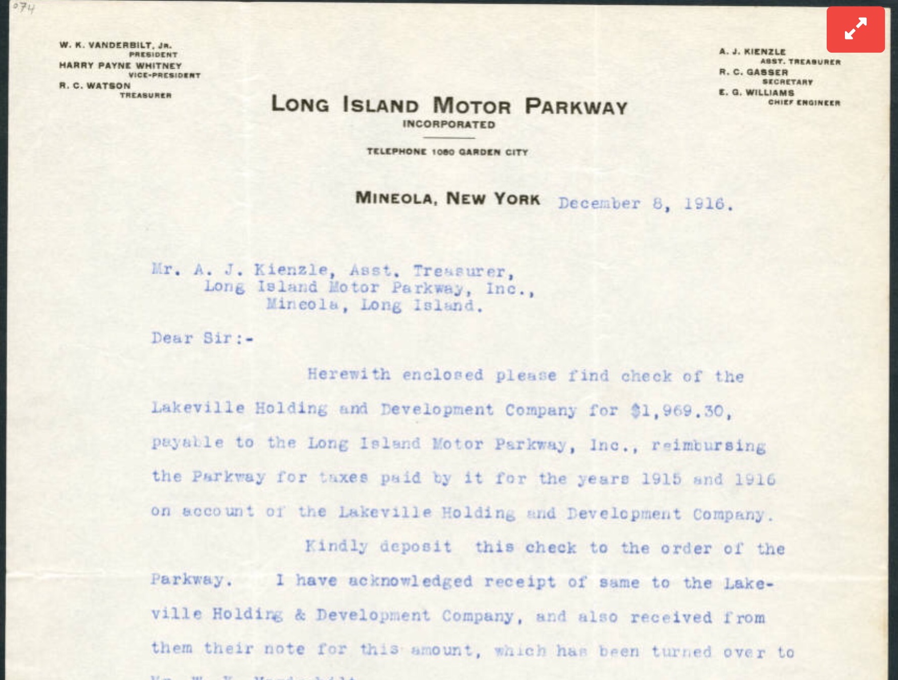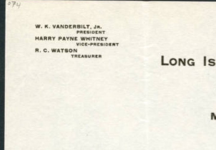 Here, in a letter dated December 8, 1916, we see 'R.C. Watson Treasurer' in the letterhead from the Mineola Motor Parkway office. It is unknown how long Watson held the position.