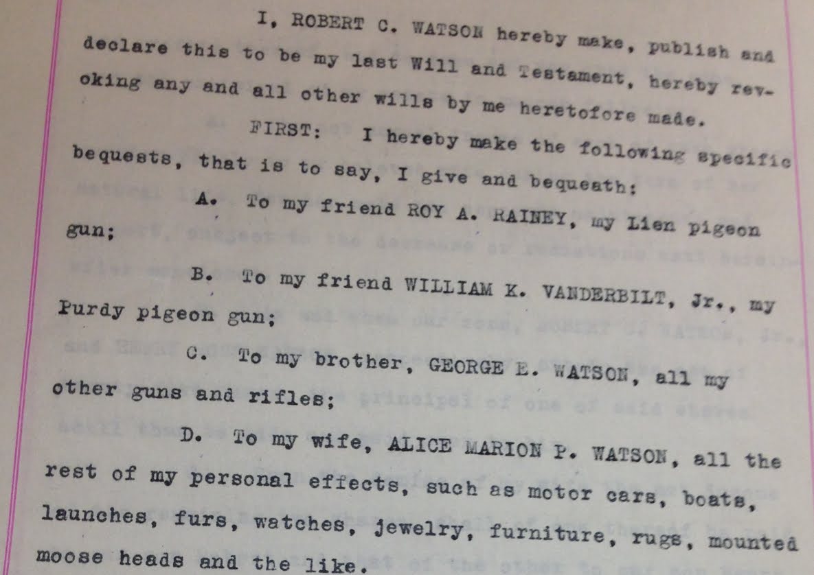 RCW left guns to friends W K Vanderbilt and Roy Rainey.