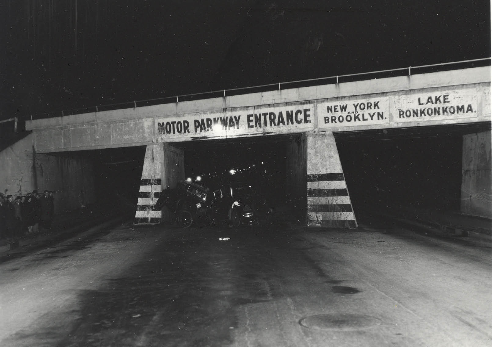 This photo gives only 3 clues on location, the Huntington sign, the electric tower, and the winding Motor Parkway under the bridge. This is the Plainview Rd highway bridge once located in Bethpage Park (Central Park) looking east, just coming out of Deadman’s curve 3, then curves again after the bridge before heading northeast. The vehicle may be a ‘40’s model. The date could be after the LIMP’s closing in 1938, perhaps where the roadway remained open for park use only. I wonder what the larger white sign up ahead read. Could it be for the parking lot entrance coming up?