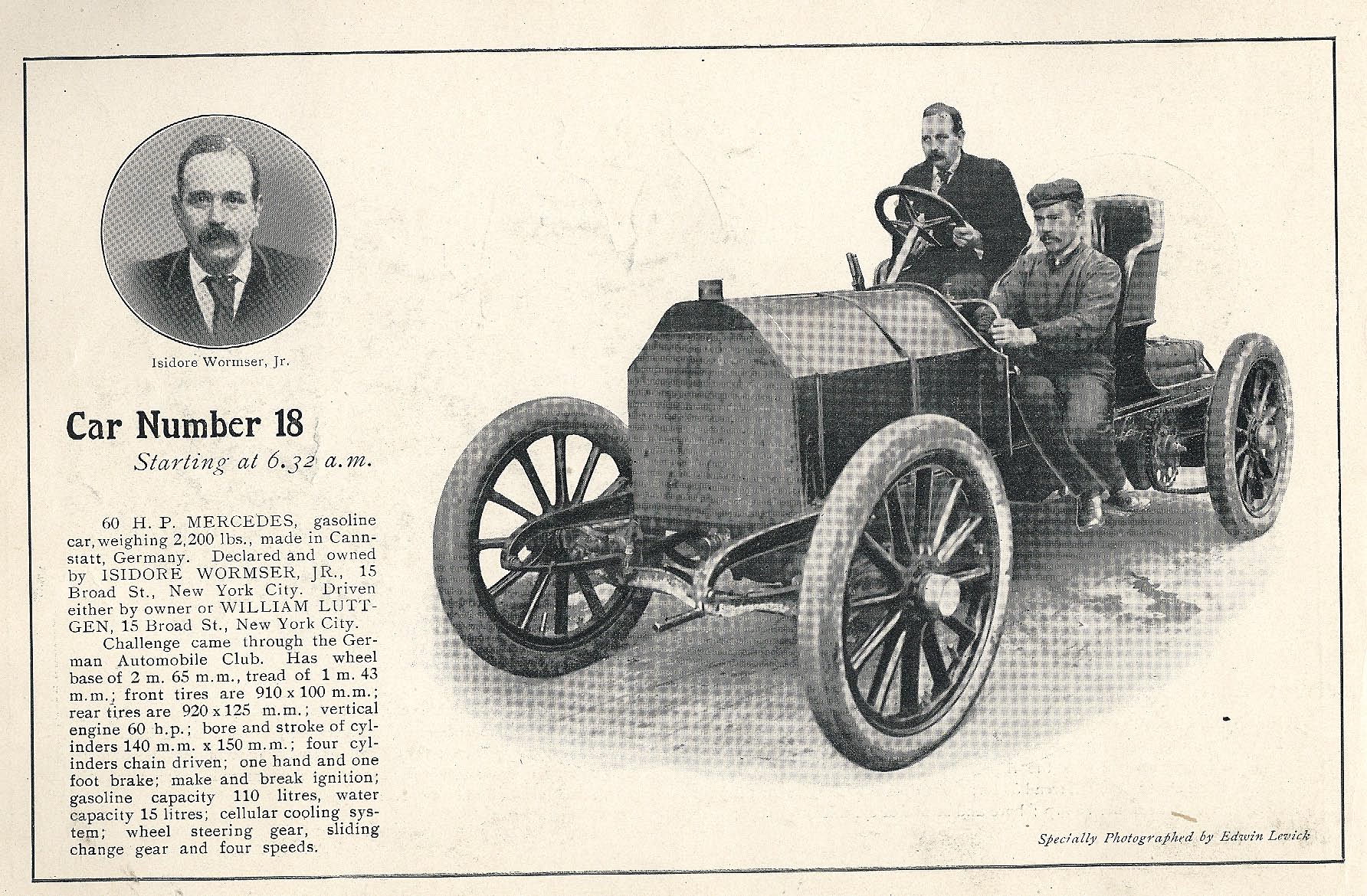 #18 Mercedes (Germany) driven by William Luttgen. 60 HP. Finished 7th. Running in near grandstand when race was stopped. Averaged 39.1 mph.