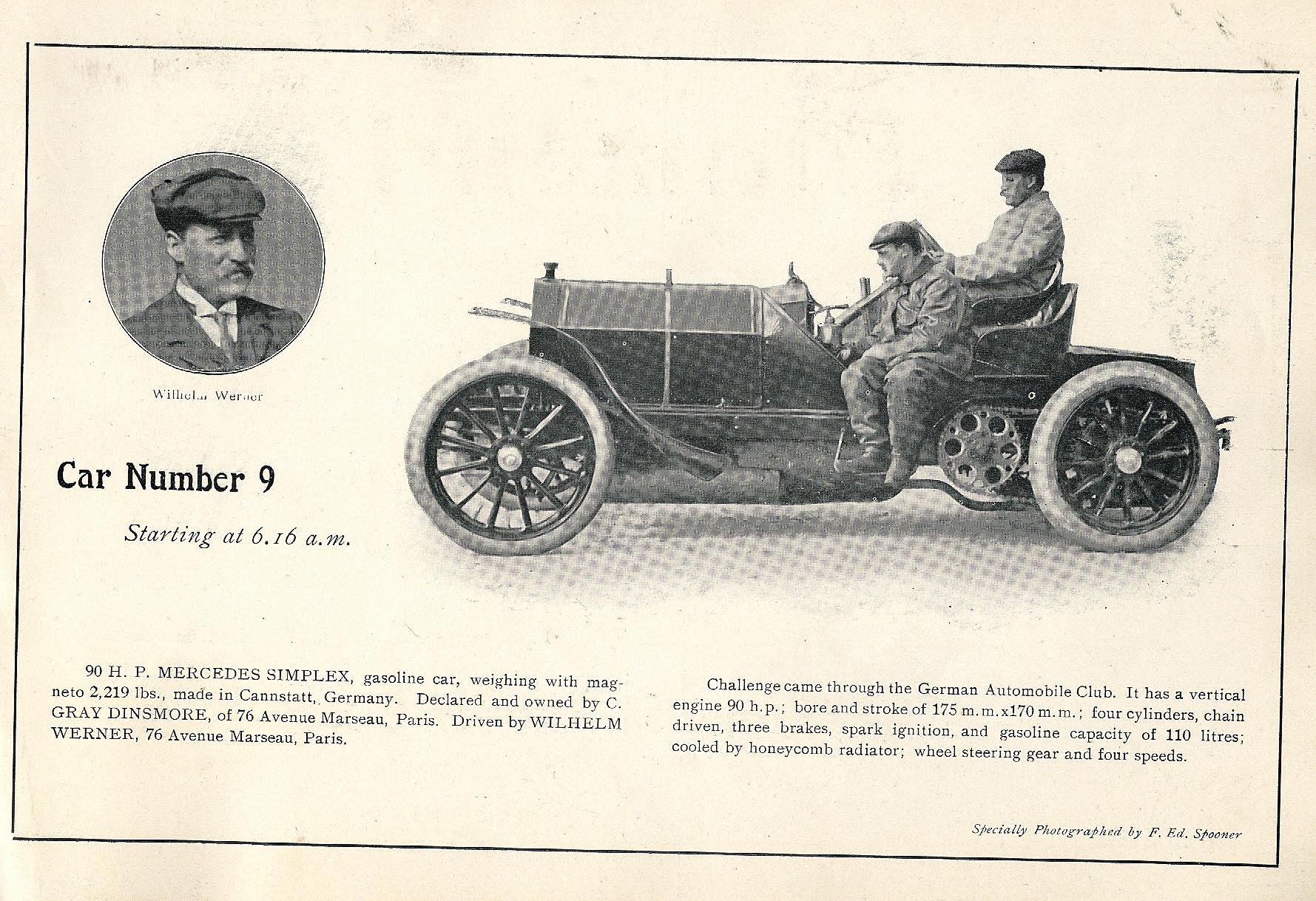 #9 Mercedes (Germany) driven by Wilhelm Werner, 90 HP. Finished 15th. Broke cylinder at Mineola RR crossing on Jericho Turnpike during lap 2.