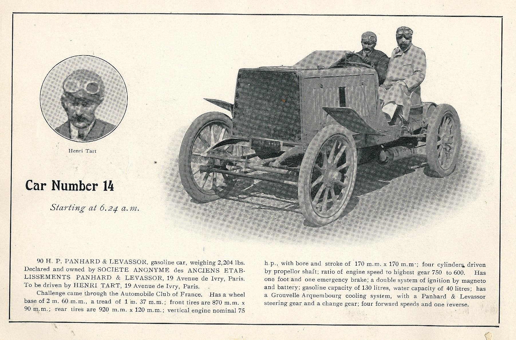 #14 Panhard (France) driven by Henri Tarte, 90 HP. Finished 6th. Fixing tire near grandstand when race was called during his 9th lap. Averaged 41.9 mph.