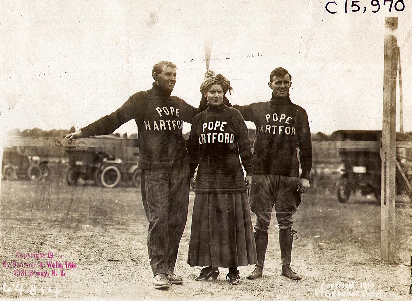 Here Dingley (right) posed with his teammate Jack Fleming (left) with a member of the Pope-Hartford team. Note the California flag that was proudly displayed.