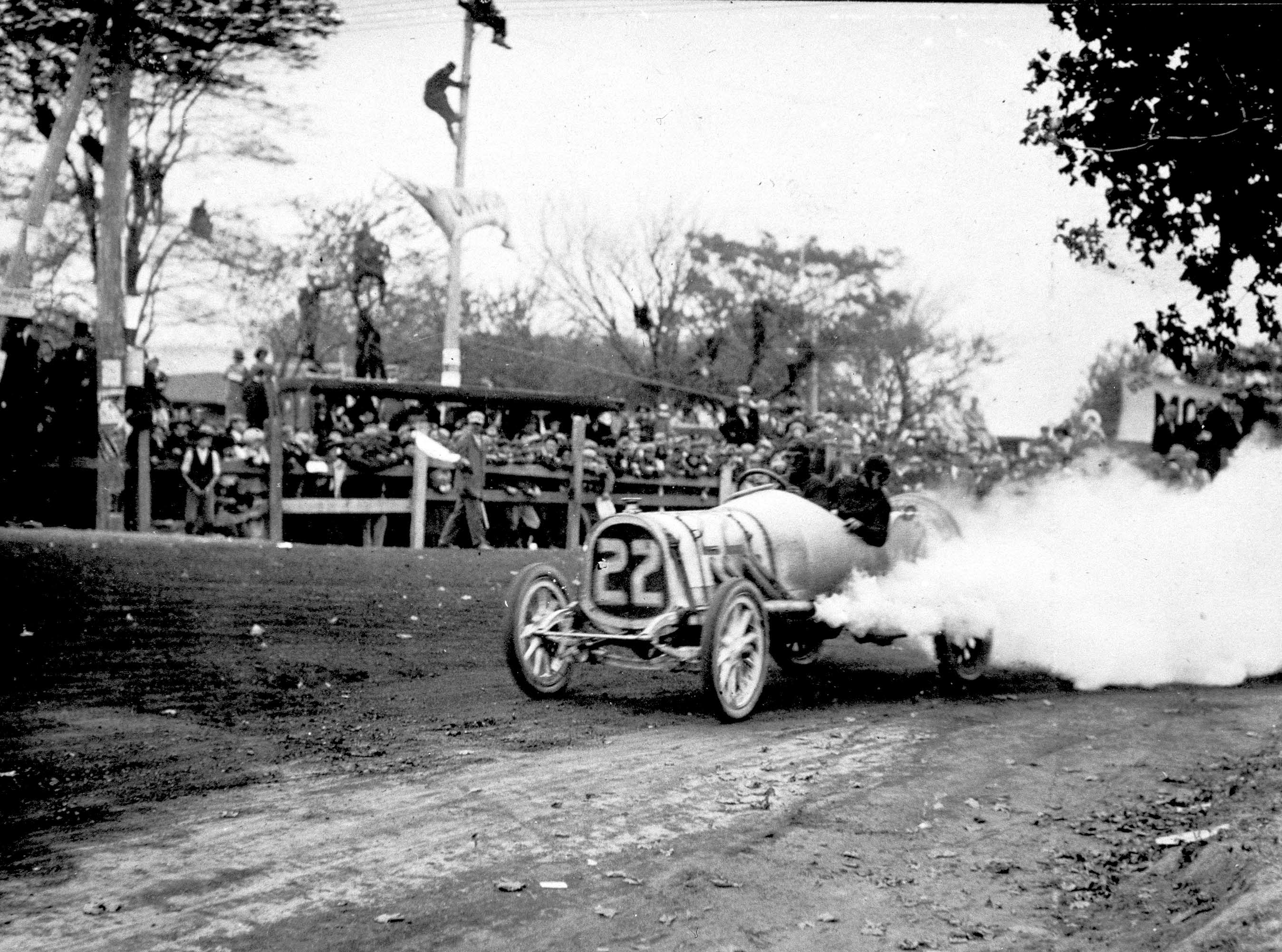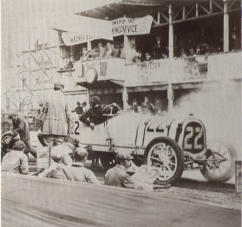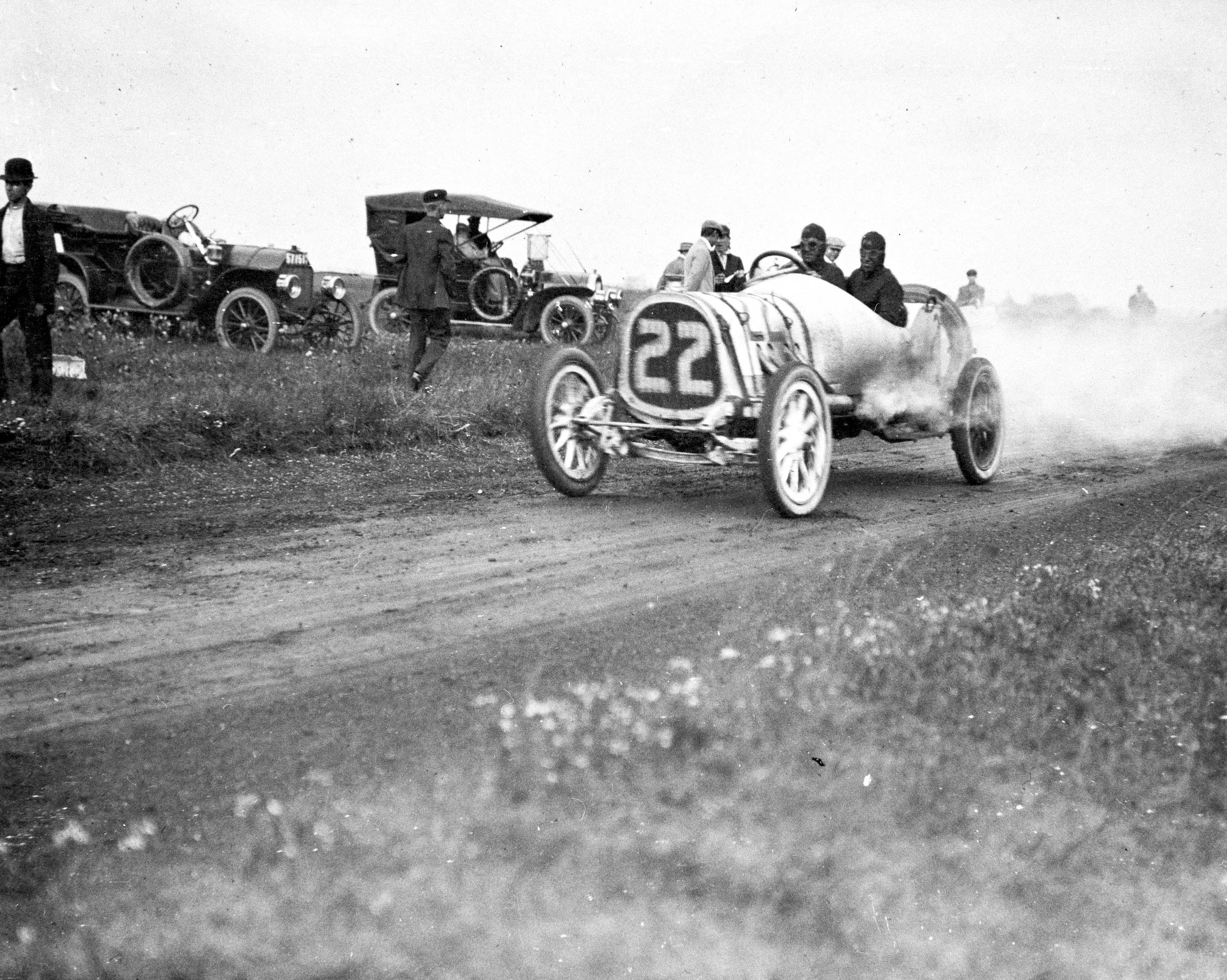 At the end of lap 8, the #22 Pope-Hartford was running strong in fifth place among the field of 30 cars in the 22-lap 278 mile race. Note the men in the service "pit". The 1910 pit rules were revised allowing two of the pit crew to assist and driver and mechanician. However, this assistance was limited to the replenishment of water, oil, and fuel and the replacement of tires. These crew members could also crank start the car.