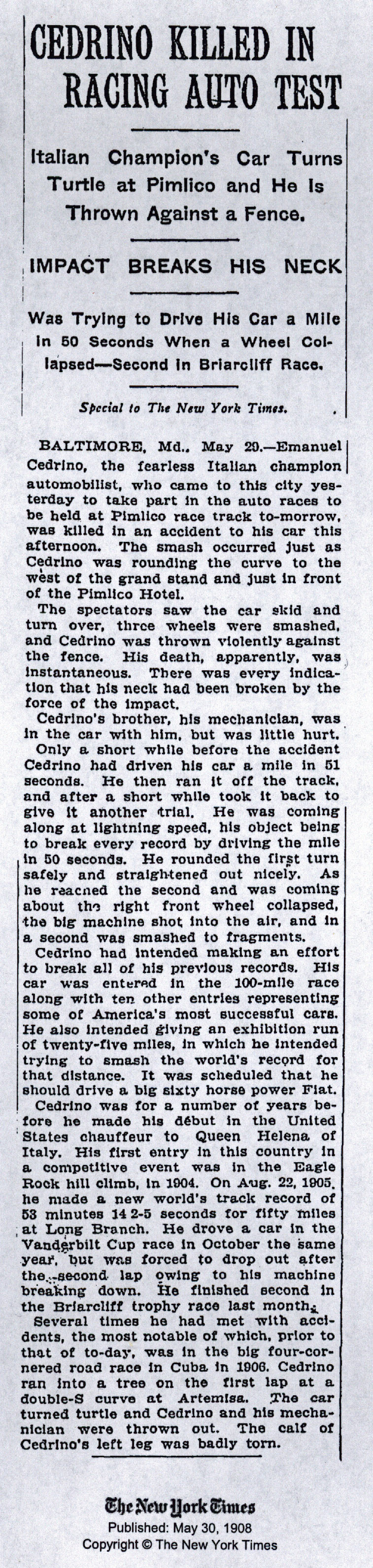 New York Times May 30, 1908 "Cedrino Killed in Racing Auto Test"
