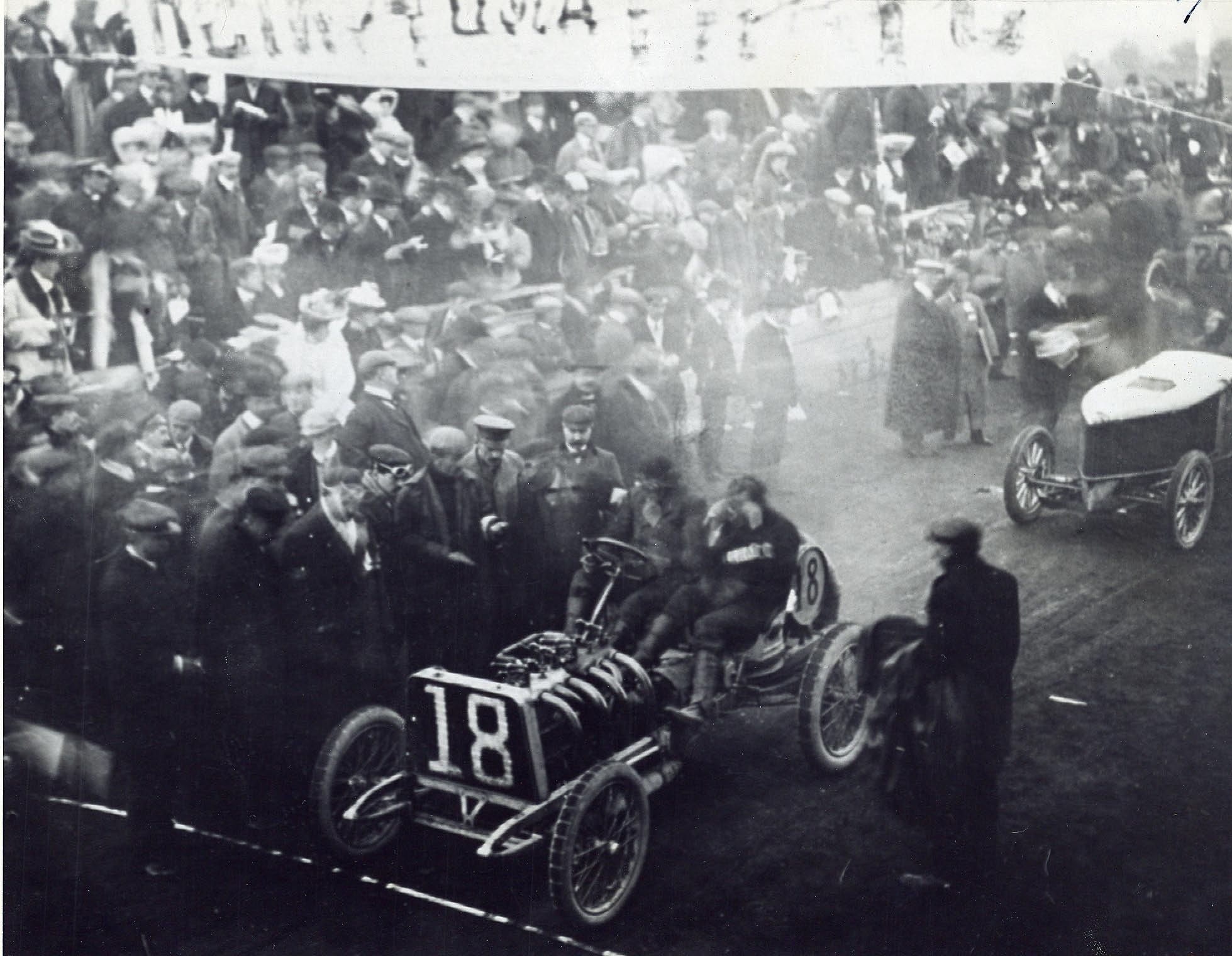 During this stop Hemery soared by Heath, which proved to be the most crucial pass of the race. Heath carved better than a minute off Hemery’s lead by the start of lap 10, making for high drama among the spectators. The two drivers were so close Heath could see Hemery’s Darracq in the distance. Telephoned reports from the 15 observation locations around the course came with updates in rapid succession, building anticipation in the frenzied grandstand crowd.