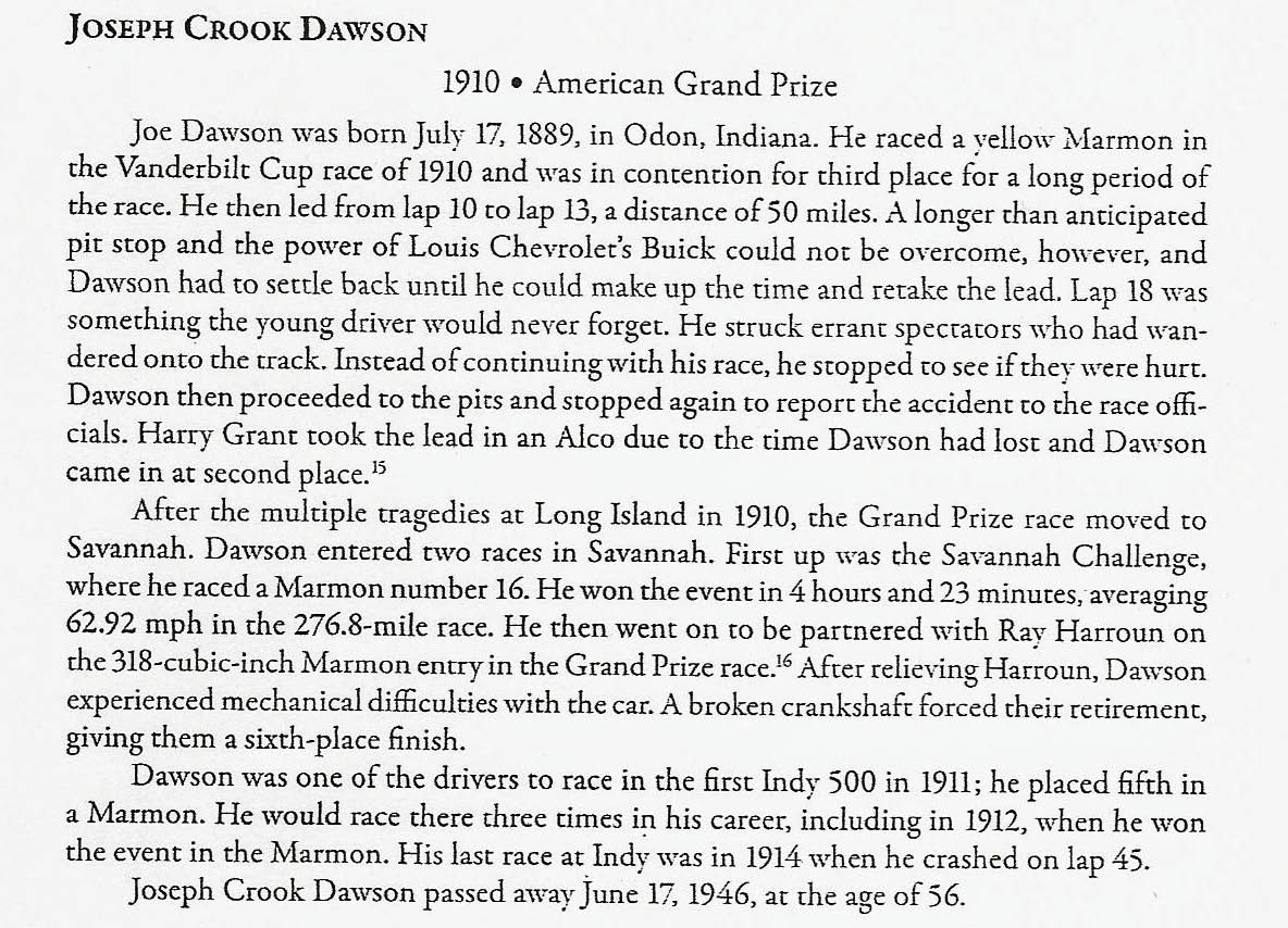 Born in 1889 in Idon, Indiana, Joe Dawson competed in the the 1910 Vanderbilt Cup Race and three Indy 500 Races (1911, 1912 and 1914). Later became an AAA supervisor and died of a heart-attack during a track inspection for the upcoming championship race. Also worked as a car dealer, mechanic and garage owner.