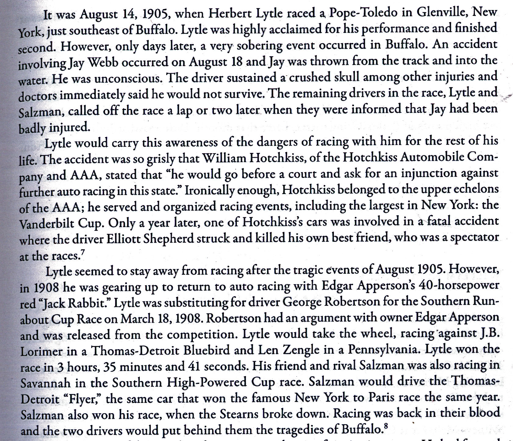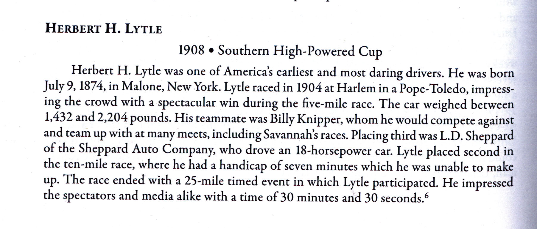 During the period of 1904 to 1910, there were 17 races associated with the Vanderbilt Cup Races held on Long Island; the six Vanderbilt Cup Races (1904, 1905, 1906, 1908, 1909, and 1910), two American Elimination Trials (1905 and 1906), and nine Sweepstakes Races (1908-5 races, 1909-2 races, 1910-2 races). Since the Sweepstake races were held simultaneously , the maximum number of races that any driver could participate in was nine. Herb Lytle (July 9, 1874 to March 7, 1932) competed in 6 of the 9 possible races capturing one win, one second place and one third place.