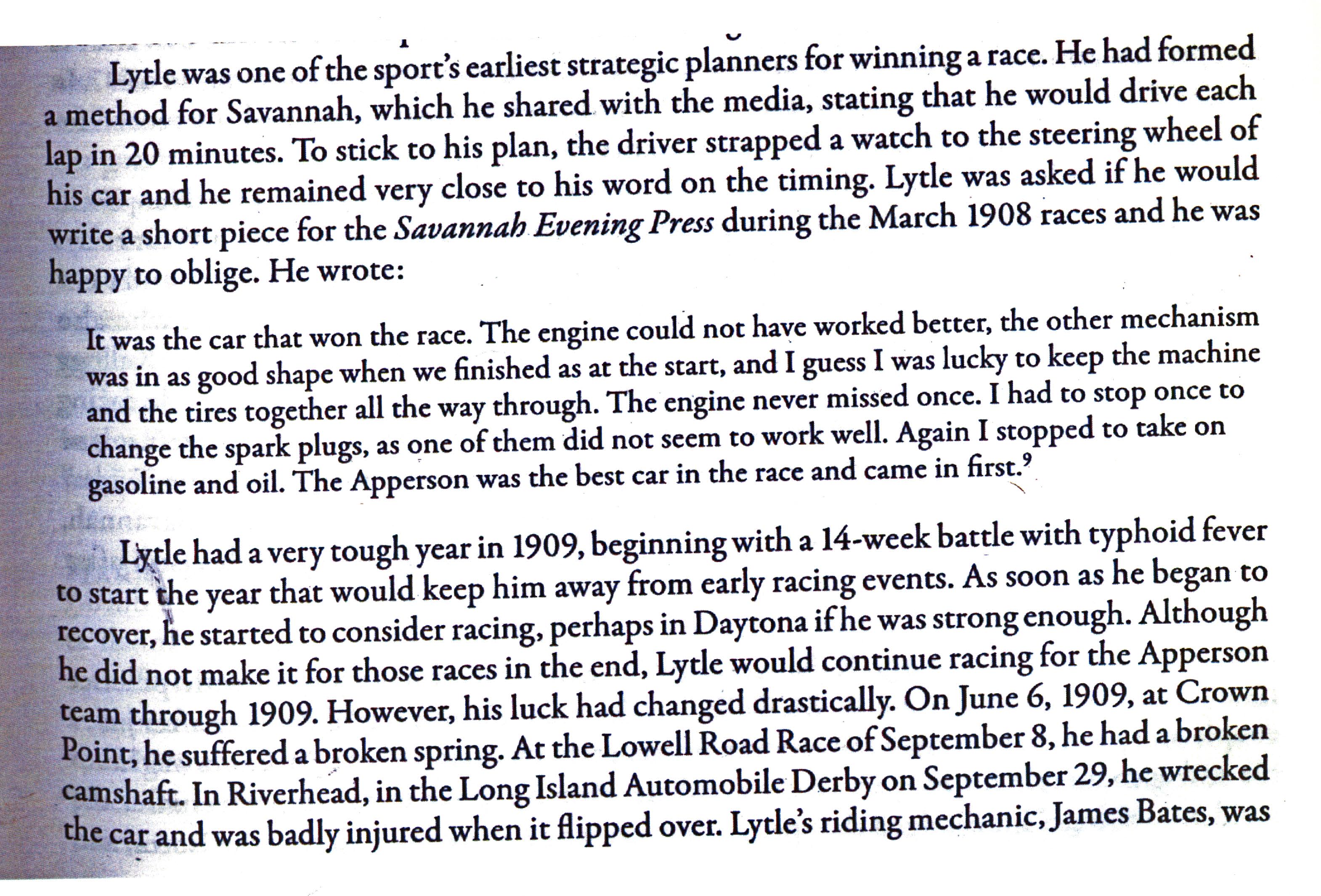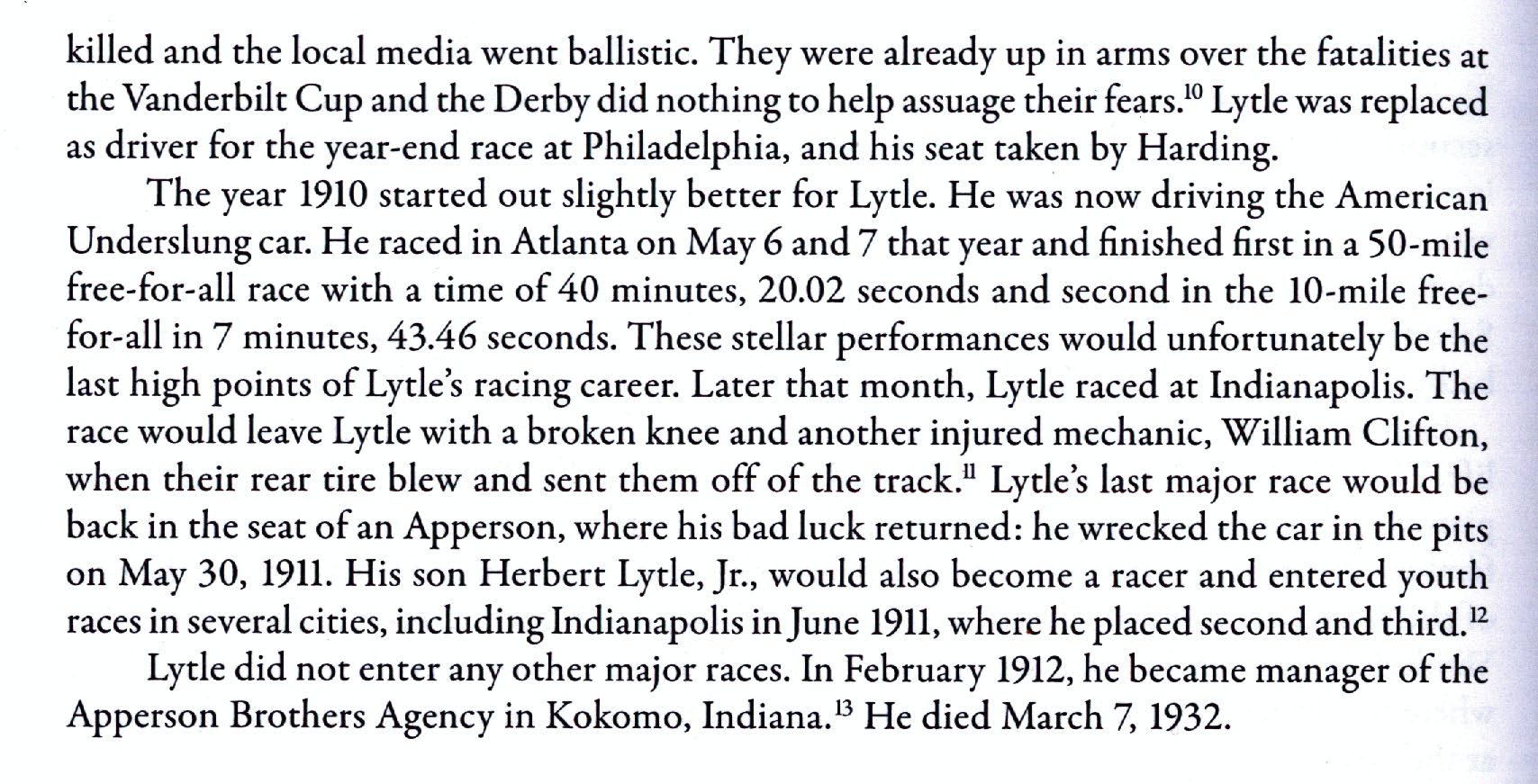 For the Inaugural Indy 500 Race, Lytle drove the #35 Apperson "Jack Rabbit". While being serviced during a pit stop at the end of 82 laps, Lytle's car was hit by the #8 Case and was taken out of the race. The accident can be seen at the 2:40 minute mark of this film. No one was seriously injured.