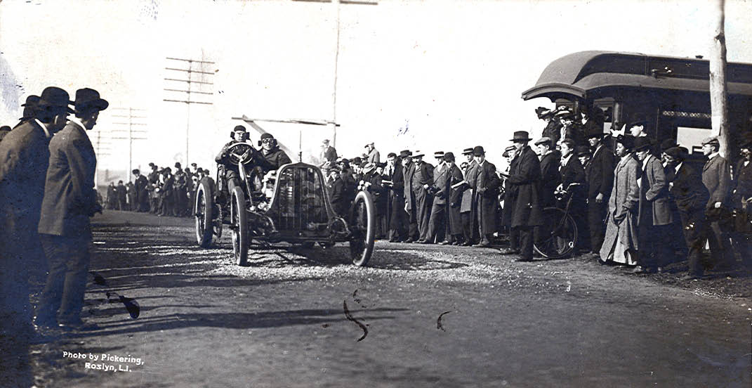 Lytle crossing the LIRR railroad tracks on Jericho Turnpike in Mineola. The photo was taken by Roslyn native William Pickering. During lap 5, the car broke a cylinder, Lytle made repairs and was running in lap 6 when the race was stopped, finishing 14th.