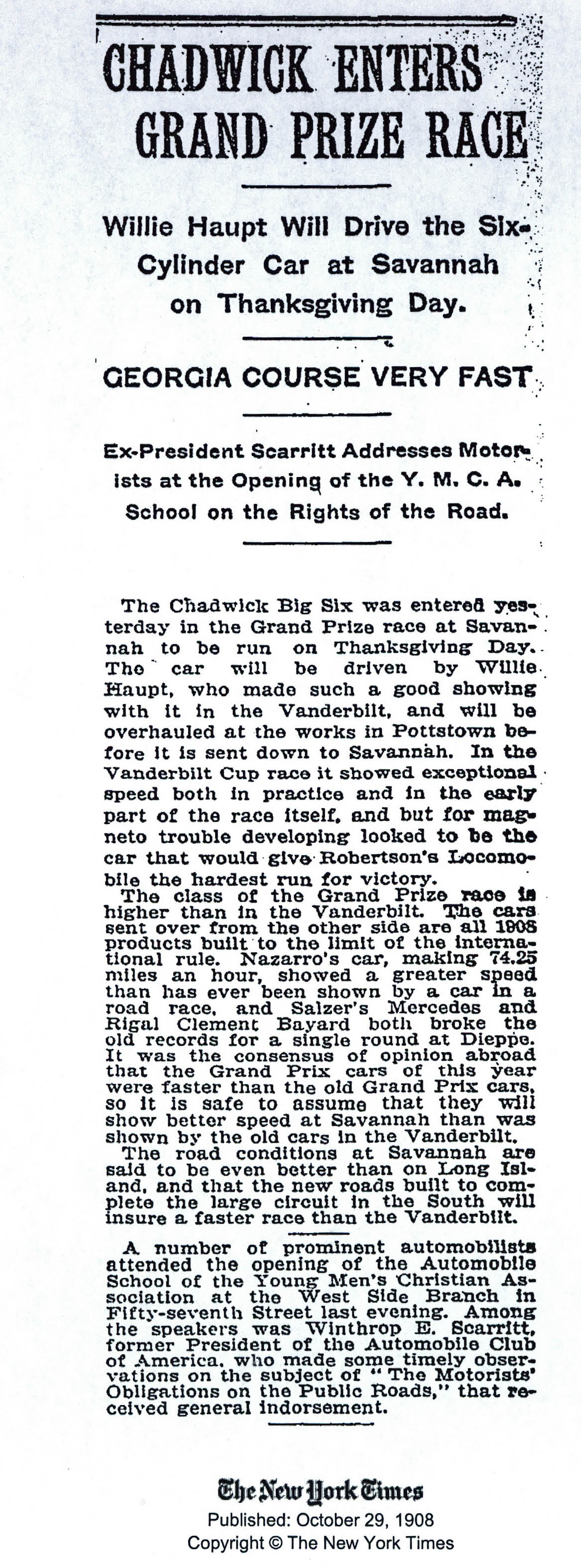 Drove the Chadwick "Big Six" in the 1908 Vanderbilt Cup Race and the 1908 American Grand Prize.