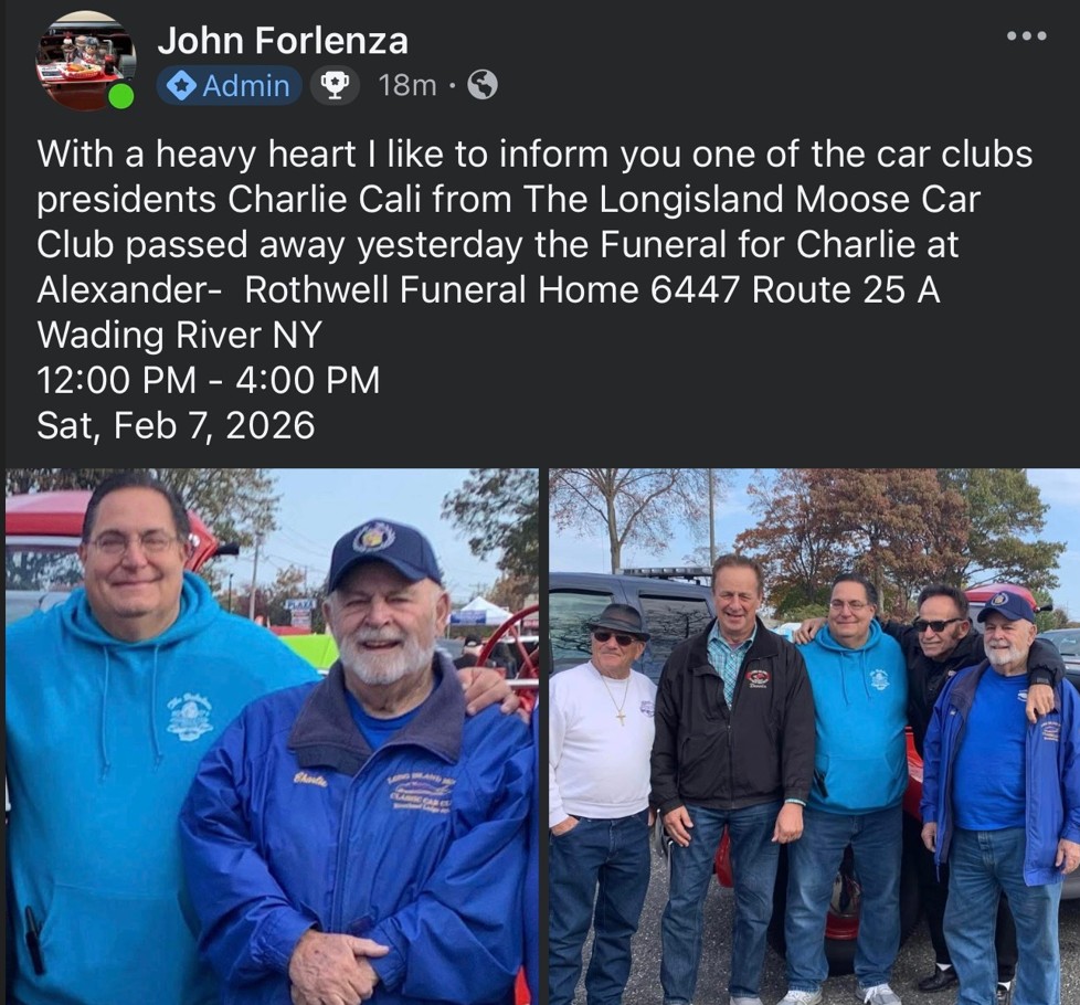 "With a heavy heart I like to inform you one of the car clubs presidents Charlie Cali from the Long Island Moose Car Club passed away yesterday. The funeral for Charlie will be held at Alexander Rothwell Funeral Home, 6447 Route 25A Wading River NY