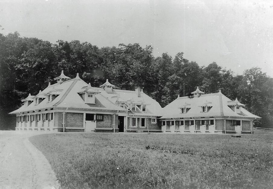 A beautiful 'Stick Style' Warren & Wetmore structure, but one cleverly designed for function. Shaped in a horseshoe shape with dog runs exiting each kennel converging in the center.