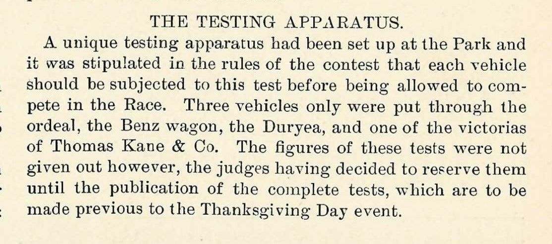 As described in the 2nd issue of 'Horseless Age' in December 1895, rules stipulated that each vehicle be tested on an apparatus called a dynamometer.